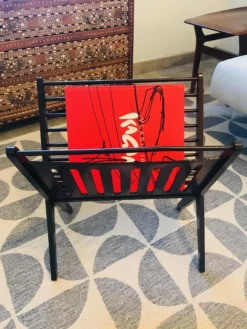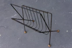 Antique English baluster and ring turned Canterbury circa 1840s, in old finish with good patina and polish. Originally used for holding sheet music in the period, this is a tasteful solution for holding your magazines. Mortise and tenon construction in fruitwood with nice old finish.