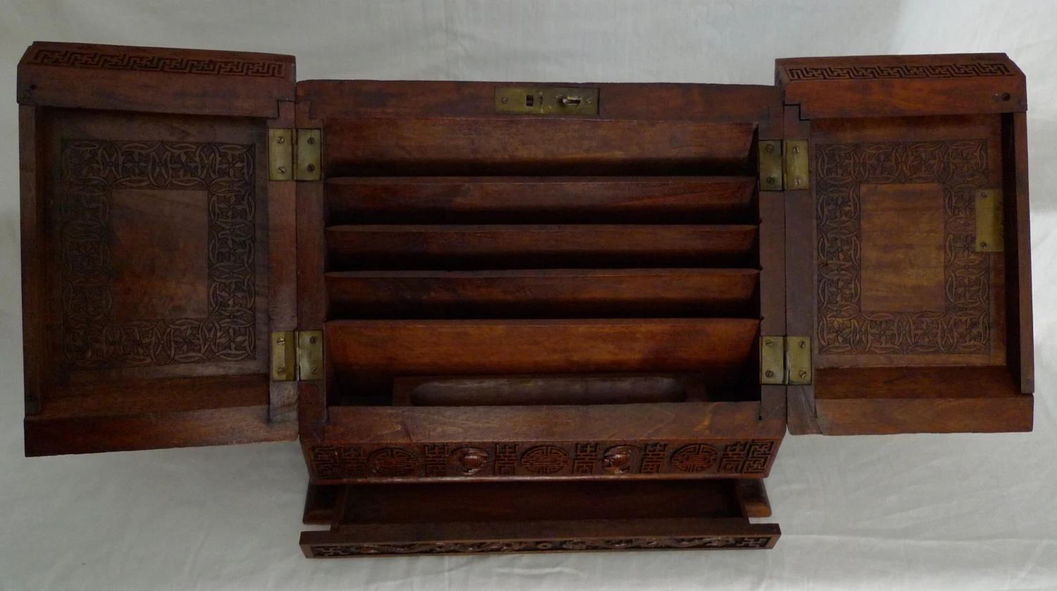 Description: Offered is an impressive and intricately carved solid wood stationary box with fitted interior, circa 1870s. Features a relief carved four-clawed Quilong dragon theme accented with floral motifs, characters and symbols, and bats. The intricately carved frame and borders are nothing less than superb. The slanted doors, with lock mechanism, open to a 5 slotted compartment, features relief carved panels opposite storage, a pen tray, and at bottom, a concealed storage drawer.