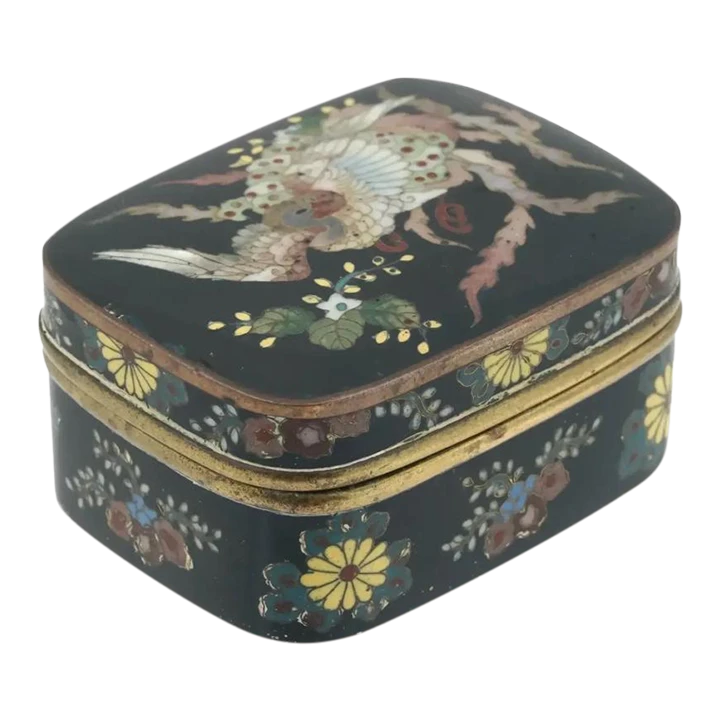 An antique Japanese Meiji Era covered enamel brass kogo or box for incense. Circa: late 19th century to early 20th century. The box is enameled with polychrome floral and foliage patterns and an image of a Phoenix bird on the top of the lid made in the Cloisonne technique. Unmarked. A kogo is used for holding incense and historically most often at the tea ceremony, the temple, or for the small worship area in the home. The kogo is also a wonderful item of character to decorate with, in addition to placing small items in, and around the house or office. Antique and Vintage Asian and Oriental Enamel Boxes, Table and Desk Wares, Home Decor, and Collectibles.
