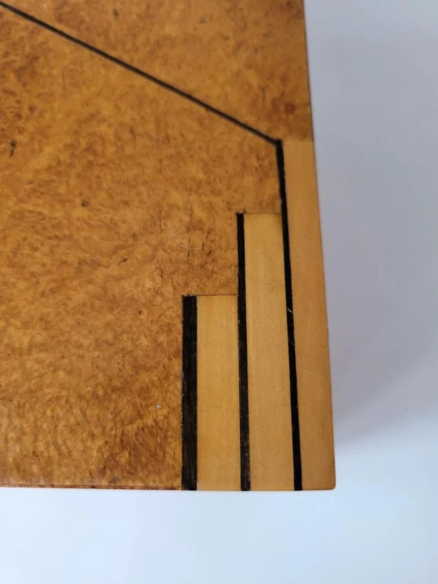 Of the period Art Deco burlwood box with inlay. Makes for a perfect desk accessory. Measures 7.5″ wide, 4.75″ deep, 2.75″ high.