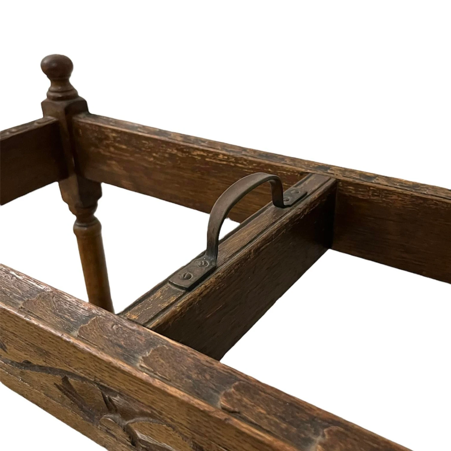 Add a nice English touch to your foyer or hallway with this charming antique oak umbrella stand from the turn of the century. Finely turned legs rising to small ball finials with intricate border carvings in oak. The stand retains its original green zinc drip tray but shows signs of wear that needed repair as shown. Otherwise, it is in very good antique condition with original finish and normal wear from age and use. A really attractive piece with a fine patina that would accentuate any decor scheme and ideal for displaying old sticks, canes or umbrellas.