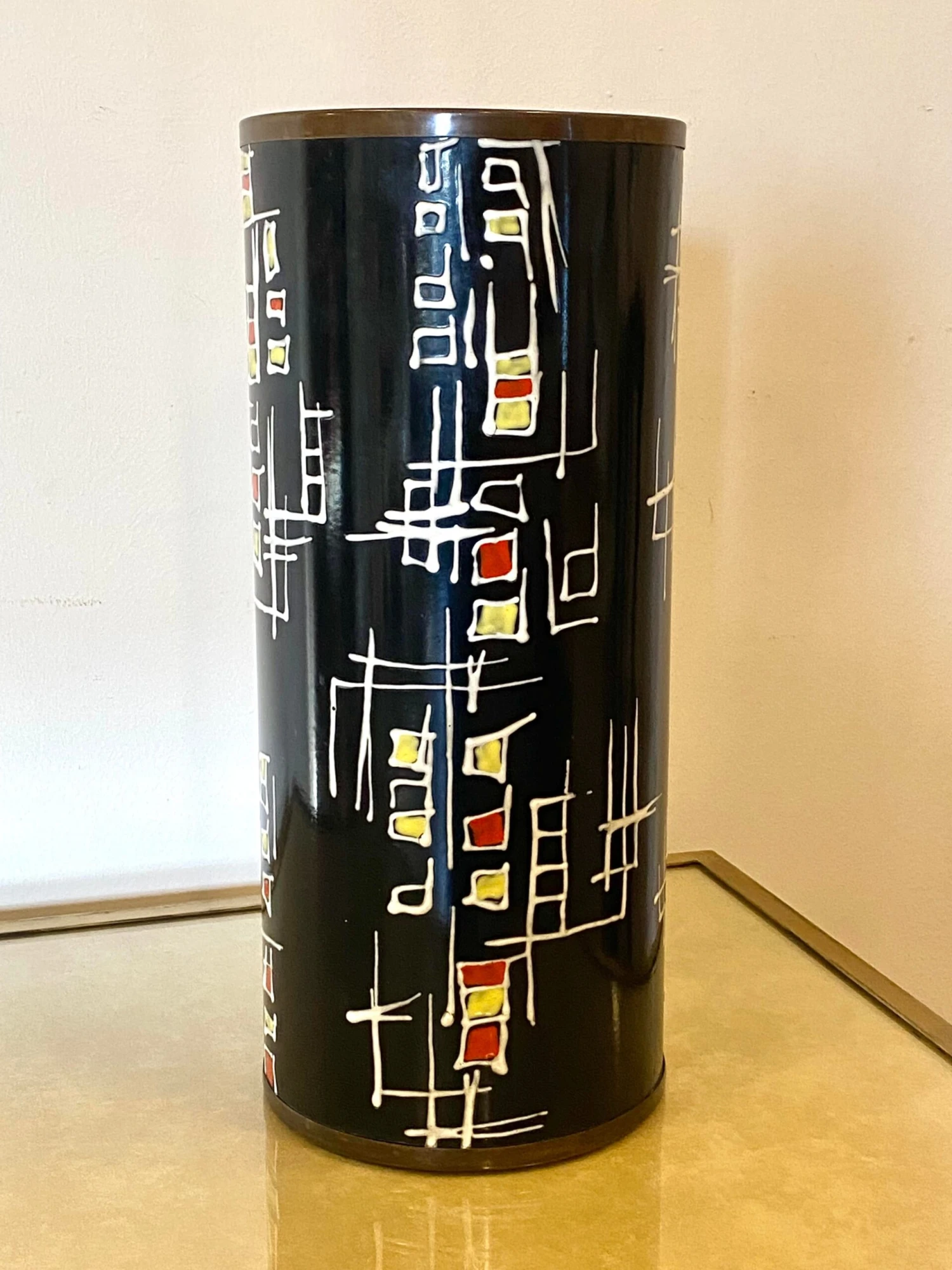 1960s umbrella stand by the firm Siva Poggibonsi in enameled copper and edges a brass This piece is attributed to the mentioned designer/maker. It has no attribution mark and no