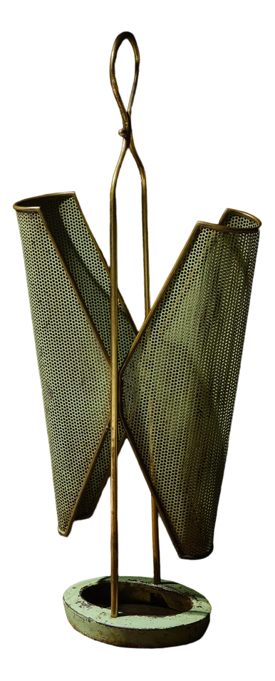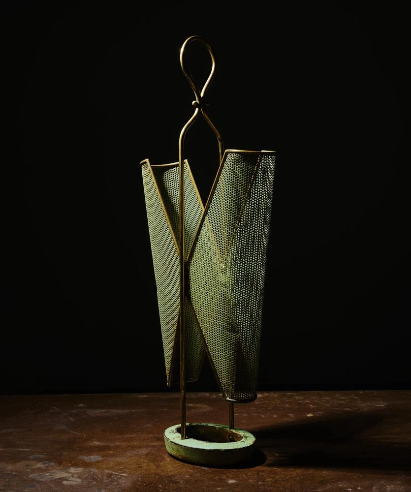 An elegant brass umbrella stand with sage green enamelled parts, designed and produced in Italy in the 1950s.