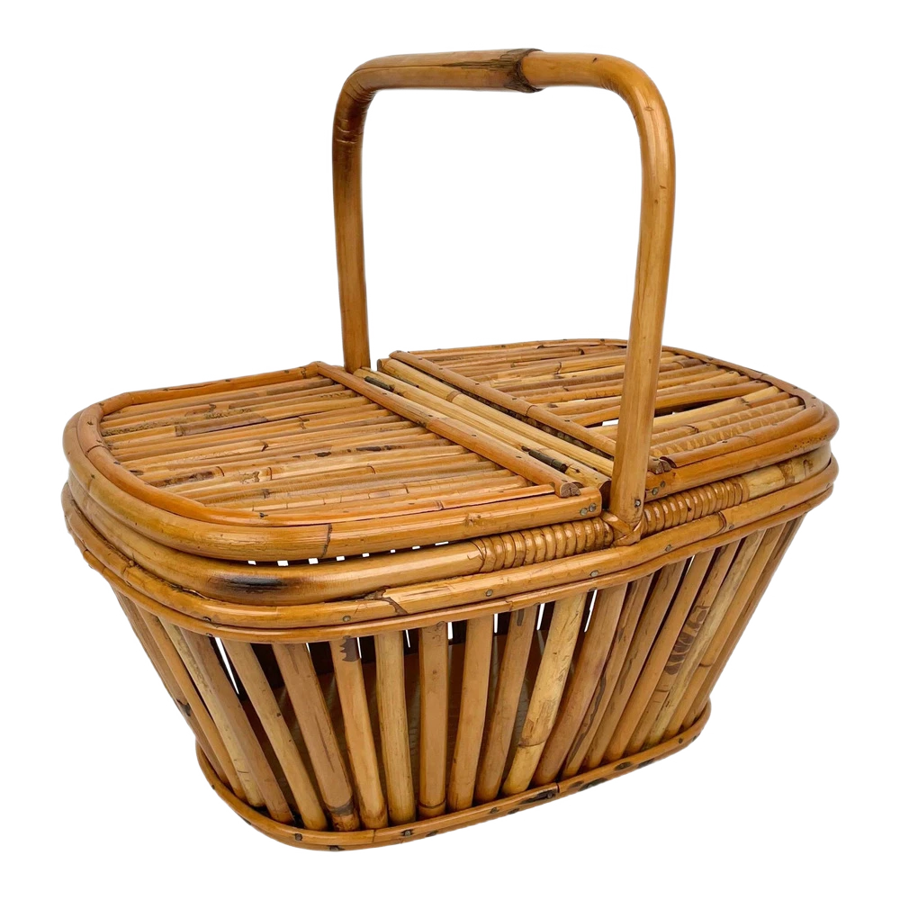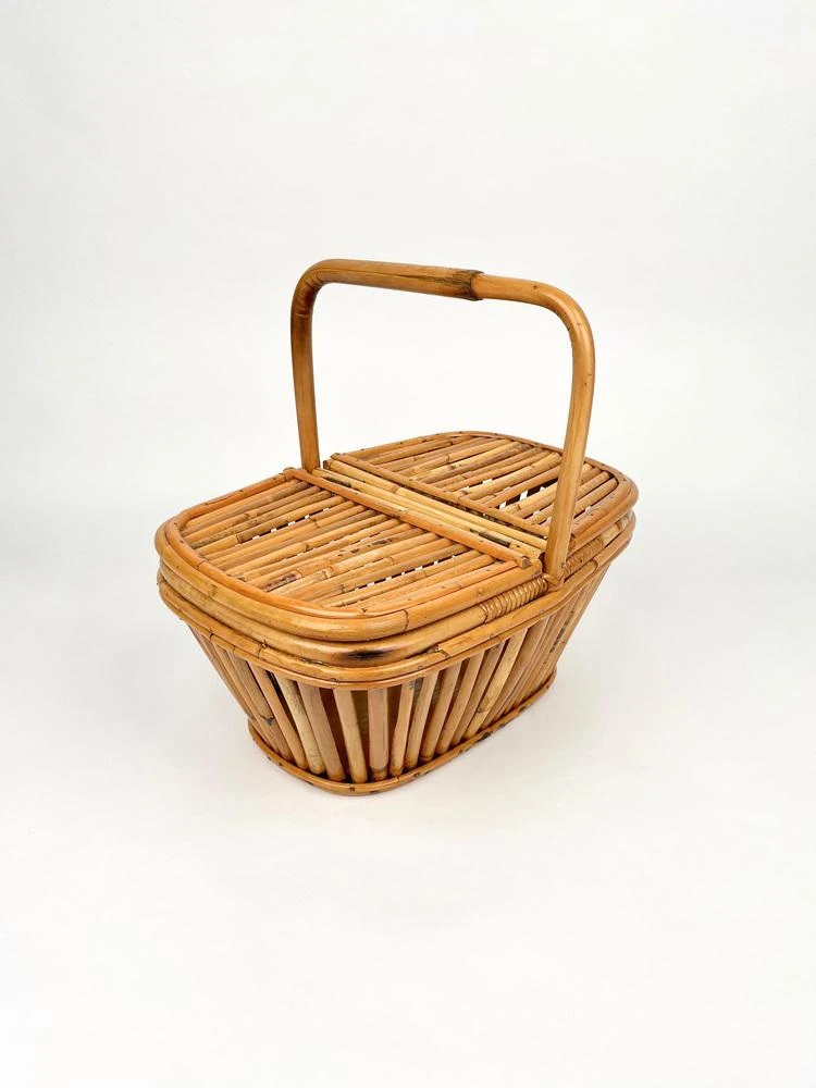 Picnic basket in bamboo and rattan with handle. Made in Italy in the 1960s.