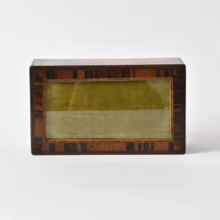 Slant hinged lid opening to a fitted compartment and conforming case with overall tooled decoration. Iron handle and latches.