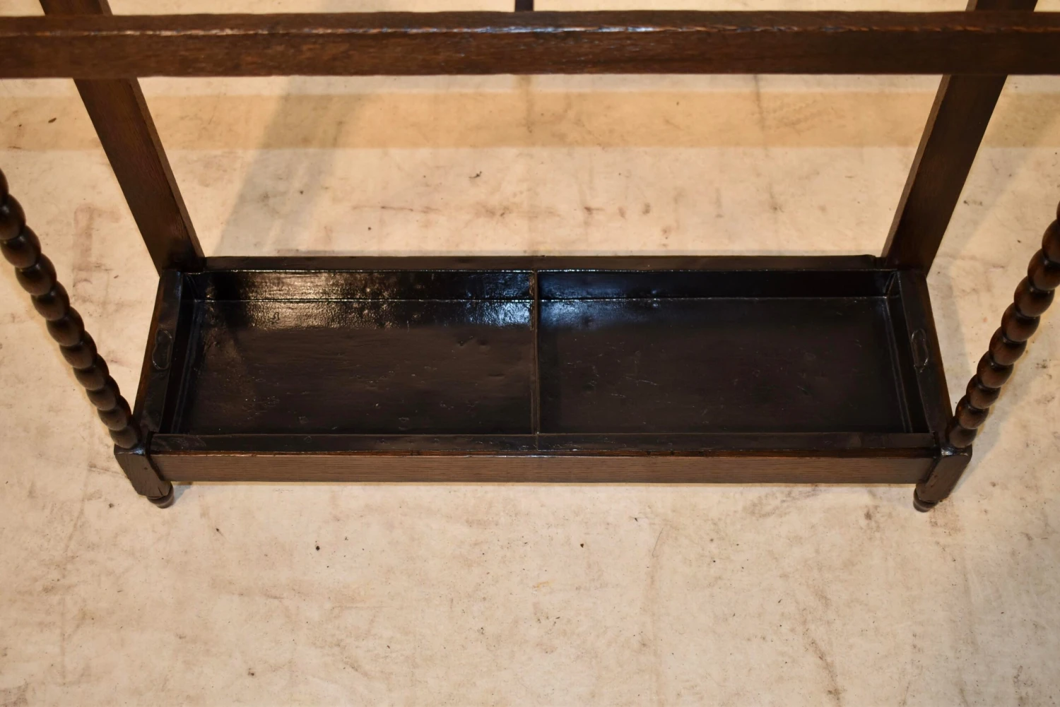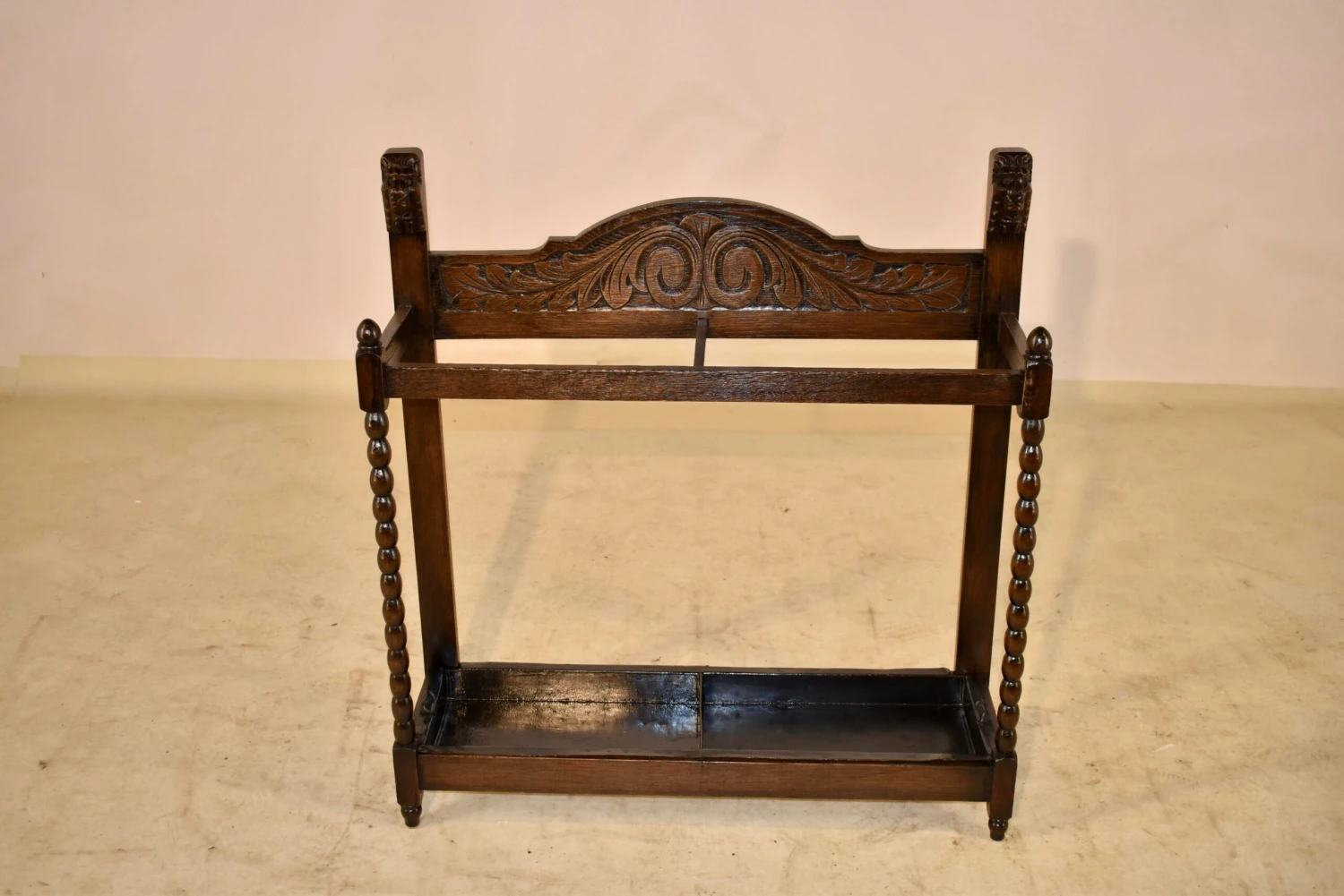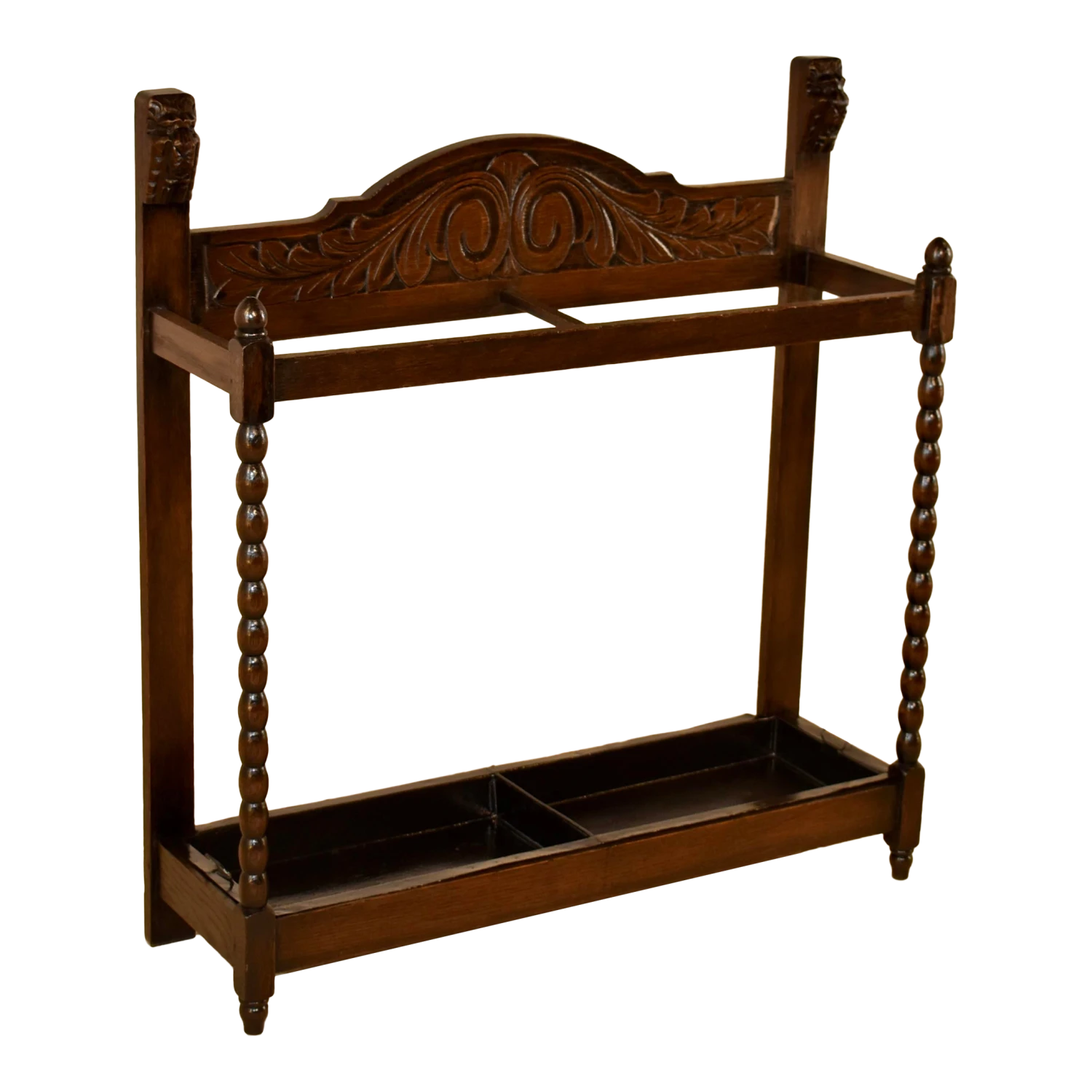 Late 19th century oak umbrella stand from England with hand carved decoration on the back, flanked by hand carved lion’s heads. The front legs are hand turned in a bobbin design and the back legs are simple to fit easily against a wall. The original drip tray is in the base and is supported in a simple frame, raised on hand turned feet in the front.