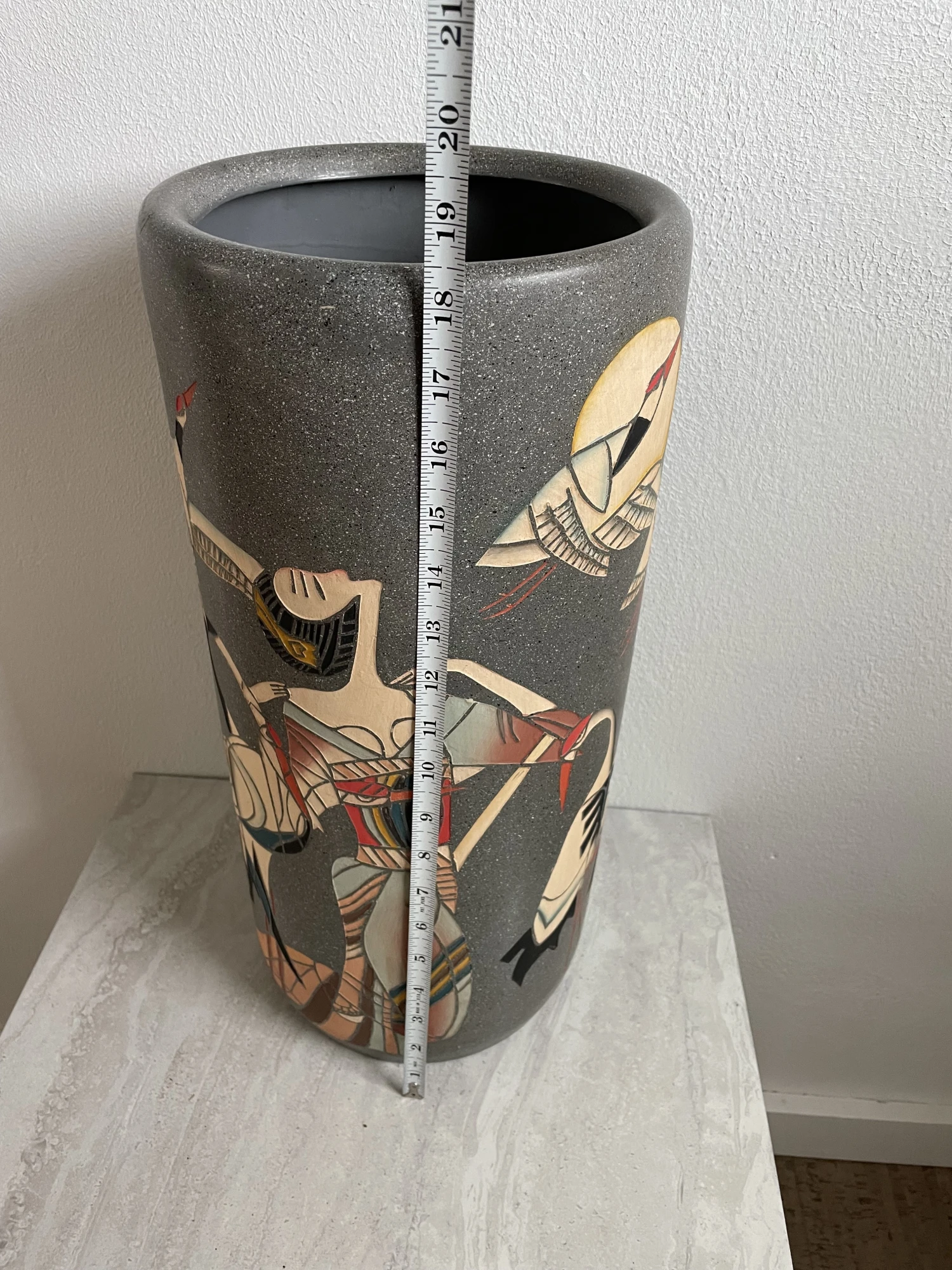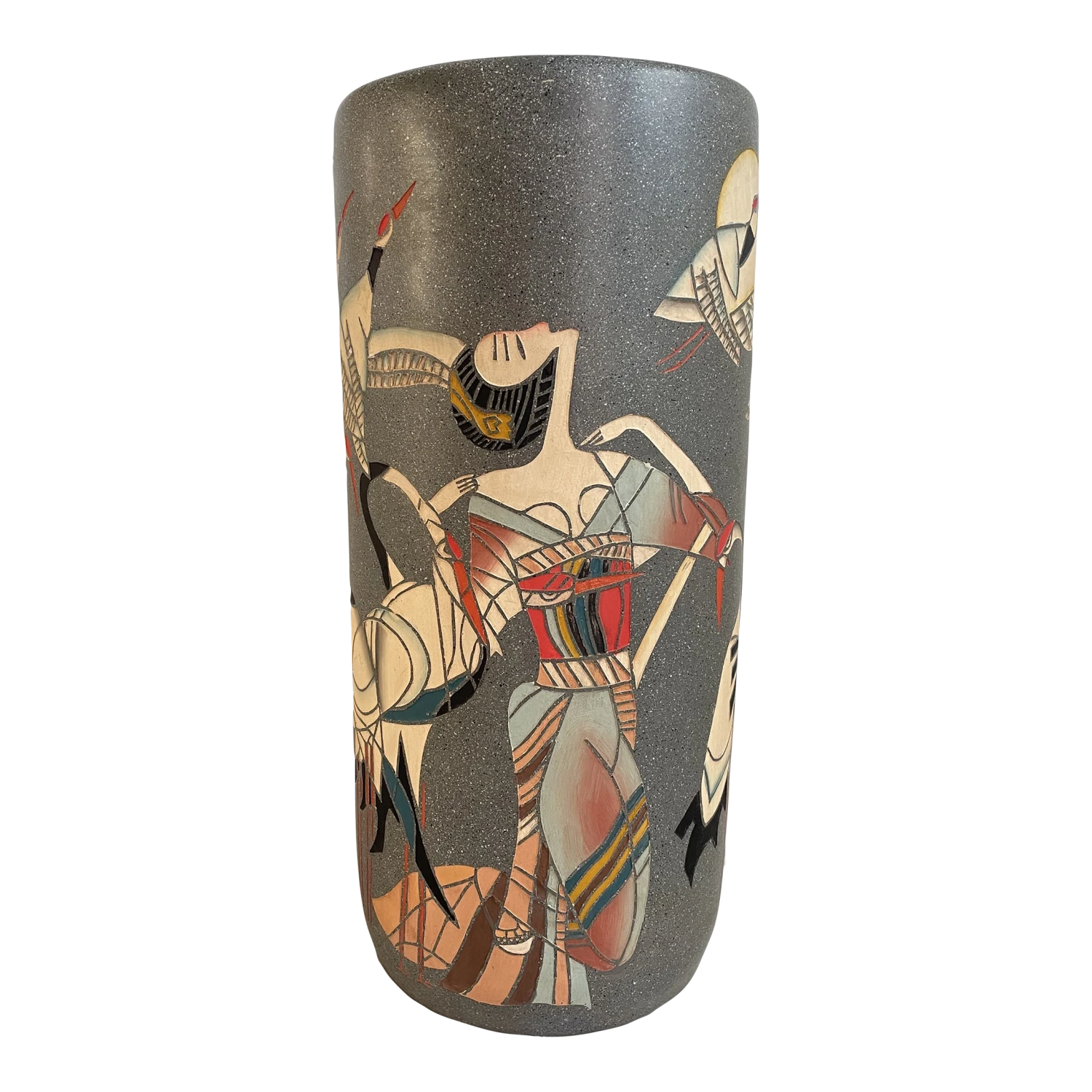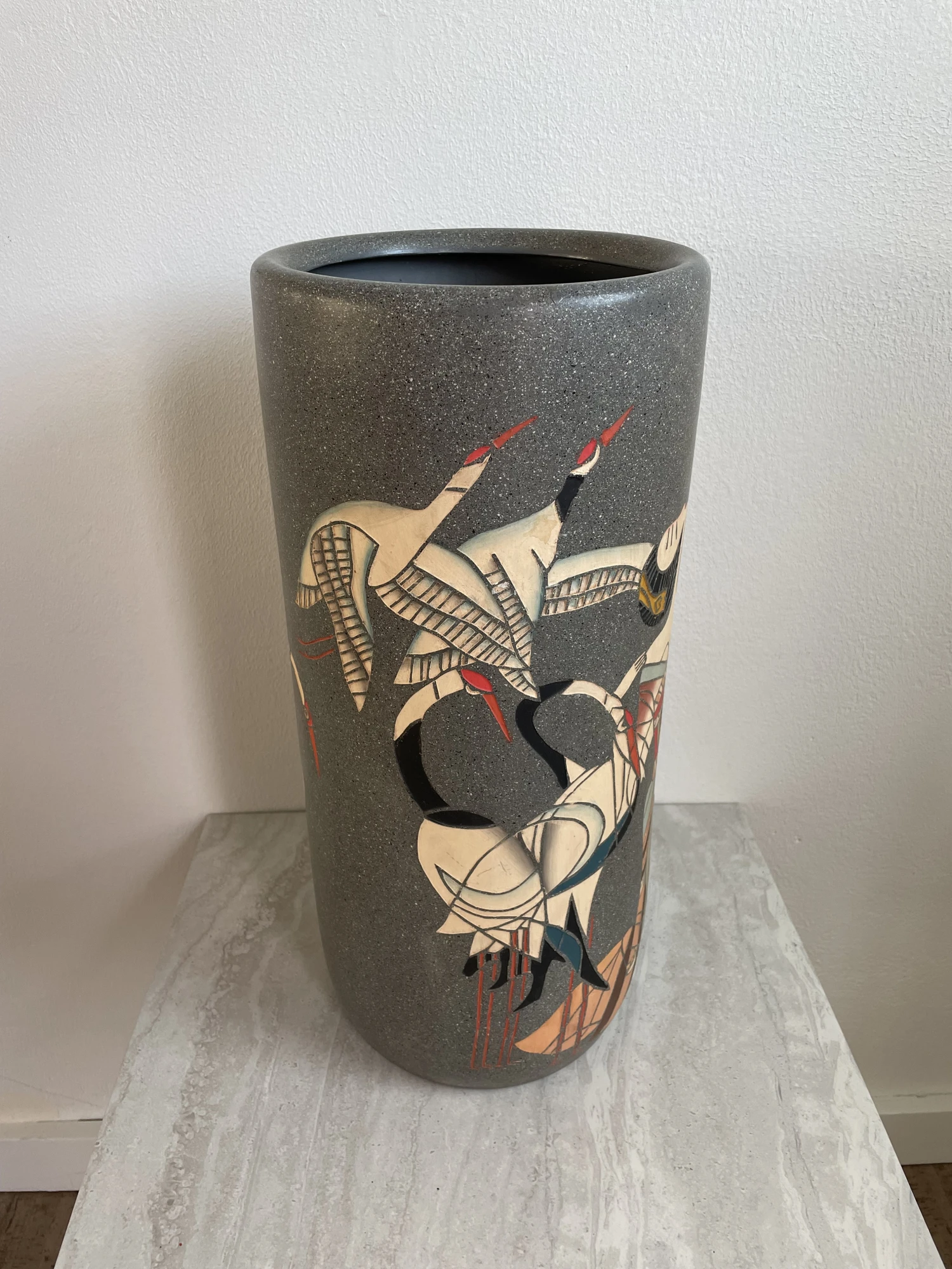 Vintage tall ceramic floor vase or umbrella stand featuring a stylized art deco Japanese motif with Geisha and cranes.
