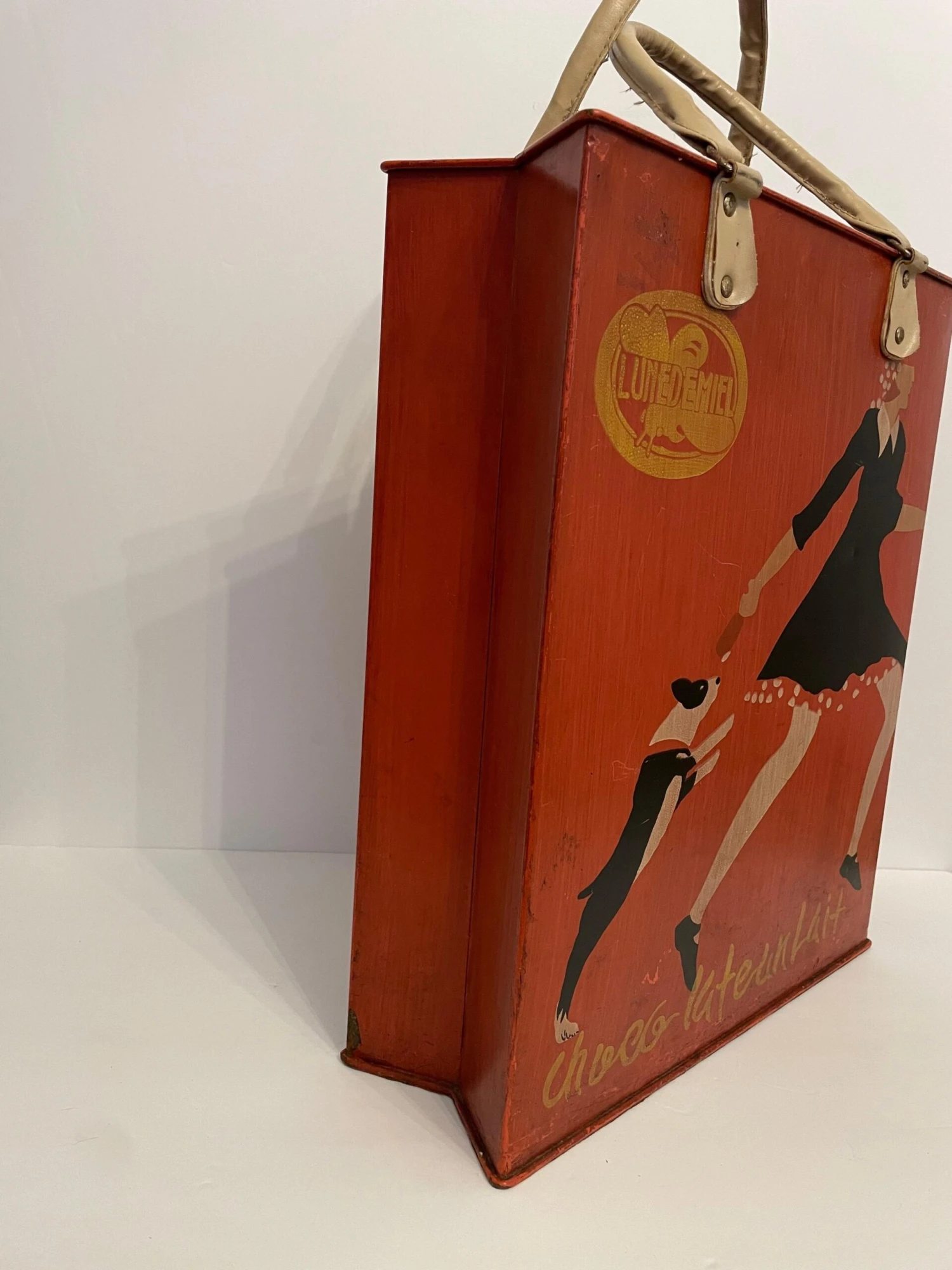 Art Deco style Umbrella stand in the form of a shopping bag. In gold neat handle is Lunedemiel (Honey Moon) and near bottom is Chocolate au Lait Painted on both sides. Measures 14″ wide x 5″ deep x 23.5″ tall with the handles. Great looking, overall good condition, with some wear to handles and rust to paint near bottom from use.