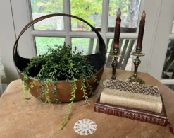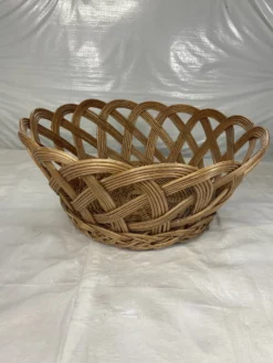 Take a look at this mid-century beauty with its boho chic swagger! Handwoven from pencil reed bamboo in an open weave style with a solid bamboo wood bottom. The base has been wrapped in a split bamboo reed while the lip and front and back center panels have been accented with an over and under rattan trim. Bent bamboo handles are firmly screwed in place allowing the basket to be carried by the handles securely. The handles do fold down, as well. It’s an attractive basket that is large enough to accommodate anything you need stylishly tucked away but close at hand. It measures 17¼” x 11¼” W/D; height with handles down 7½”; handles up 14”; interior 16” x 9½” x 6½” W/D/H; weight 2 lbs. 11 oz.; colors are natural scorched bamboo; rattan trim is a chocolate brown hue with some reddish undertones. In excellent condition with minimal, age appropriate wear. It hails from the mid 1960s. This is a basket I acquired from a private collection, at auction, from the estate of a lady who was an avid basket collector. If you a collector of unique baskets, this should be a must to add to that collection!