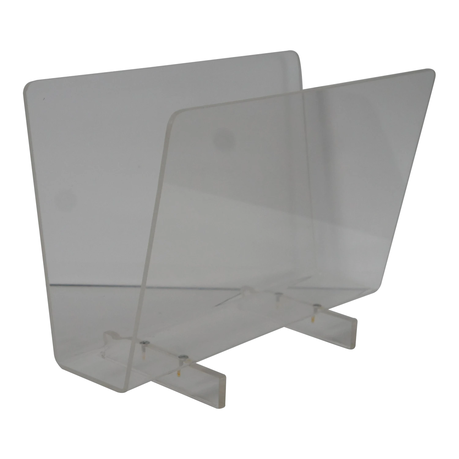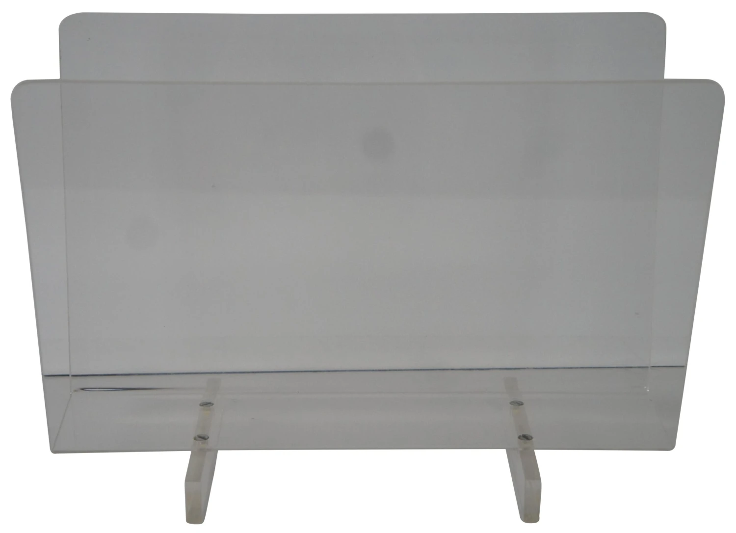 Vintage mid century modern clear lucite magazine rack, featuring a flared rectangular form and simple feet.