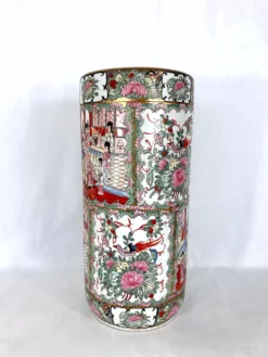 Place these large, elegant stands at your front door or in your mudroom to catch loose canes and umbrellas. Crafted in Asia, circa 1950, each circular vase shaped features a colorful hand painted pastoral scene with heron and flying bird motifs onshore; it is further embellished with top and bottom floral bands in the style of Delft. The tall antique vessels are in excellent condition commensurate with age and use, and adorns rich and well maintained colors in the blue and white palette with wonderful details.