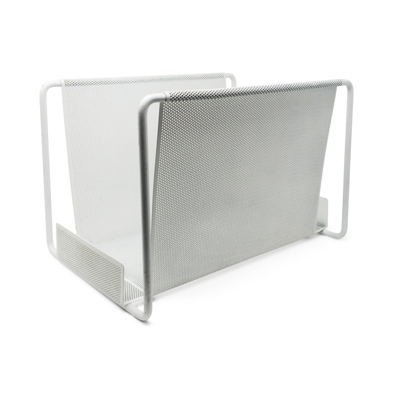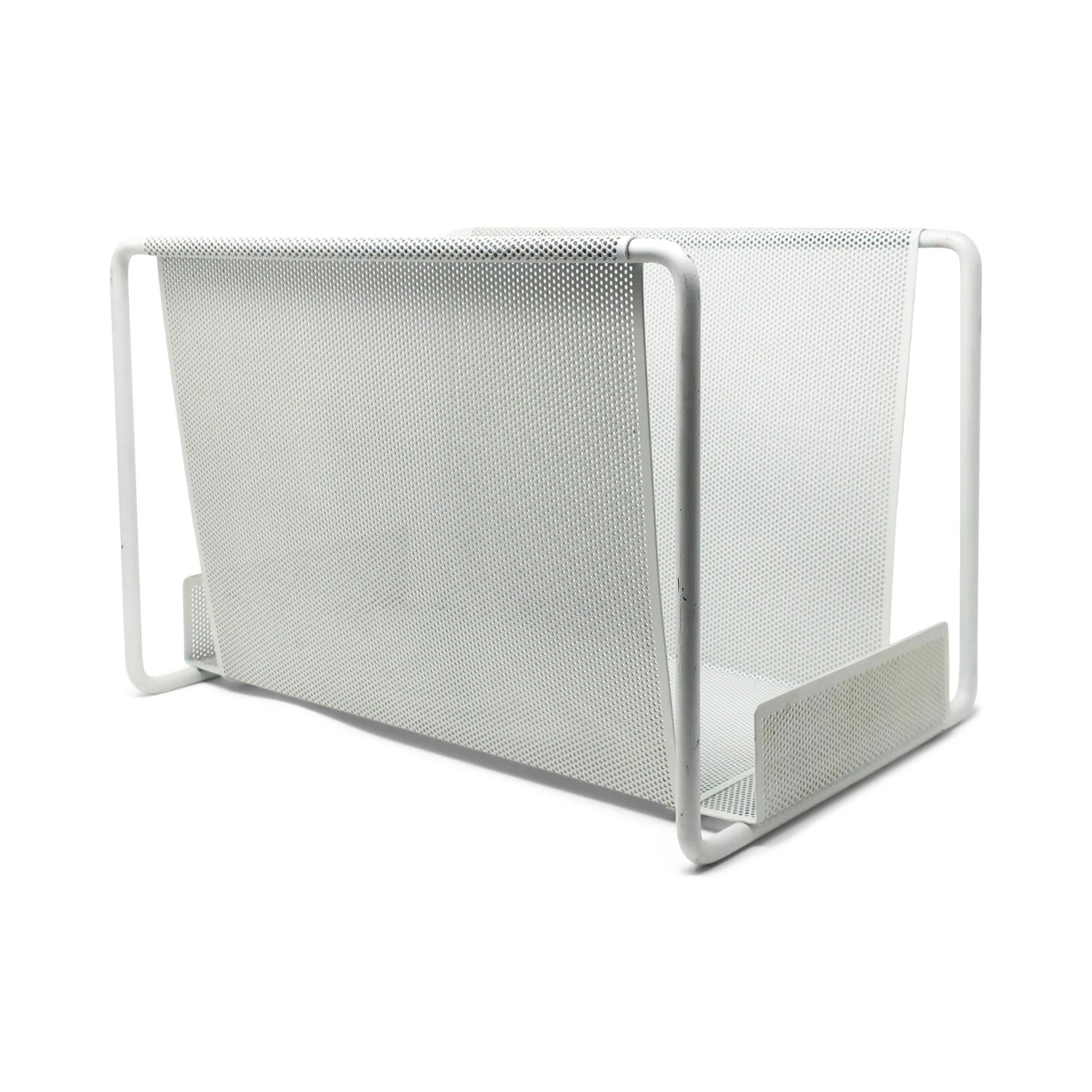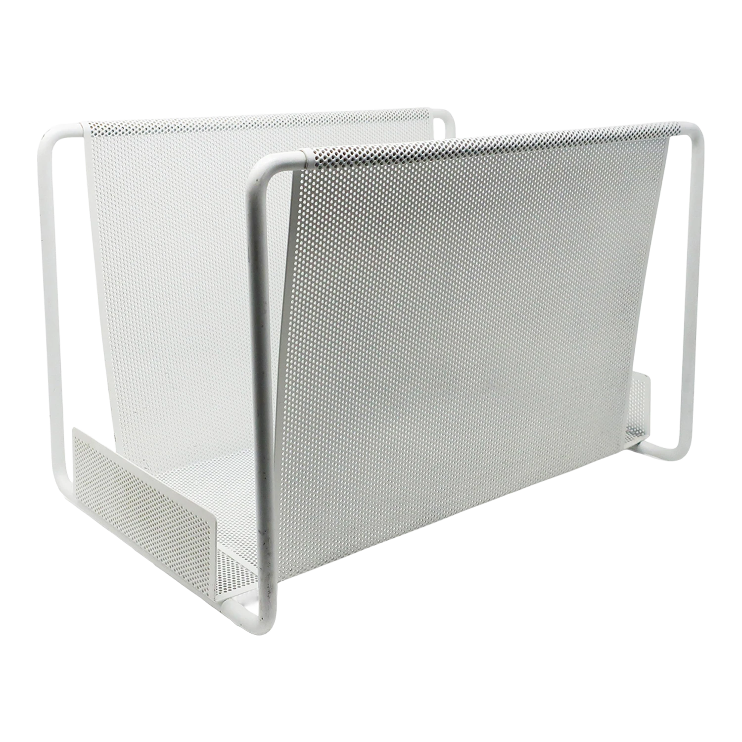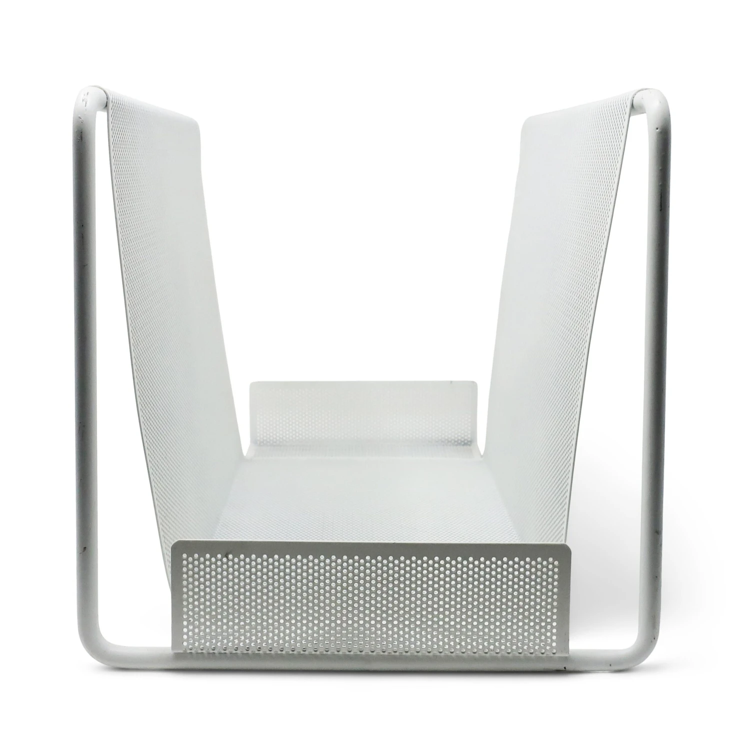 A lovely 1980s punched metal magazine rack with a white tubular metal frame. Perfect for magazines, books, or vinyl records storage. In good vintage condition with wear consistent with age and use.