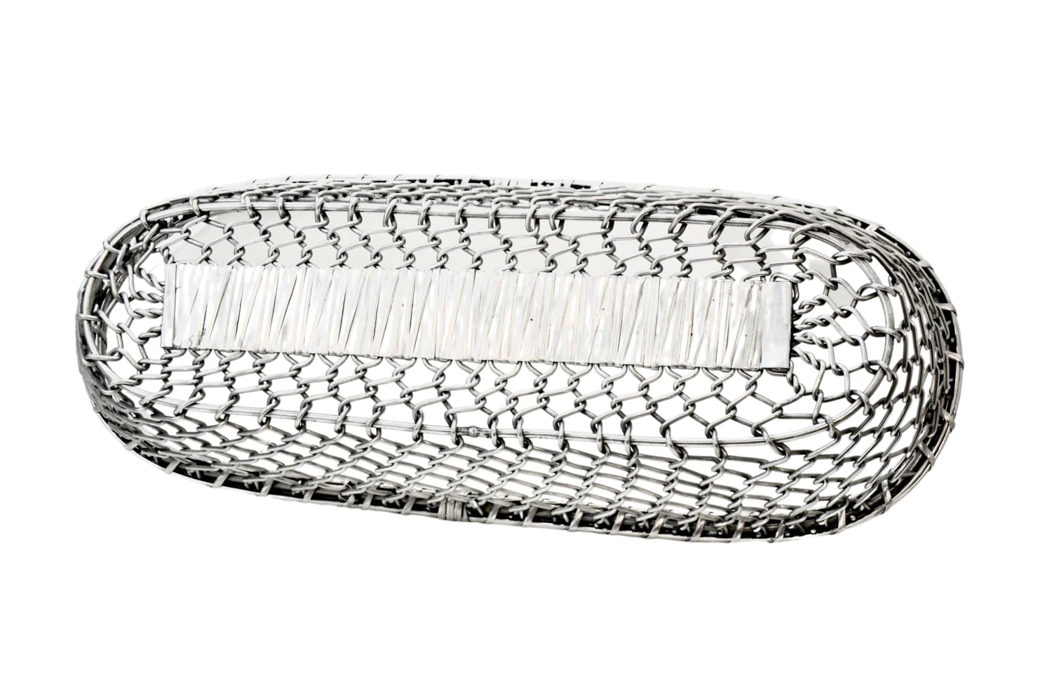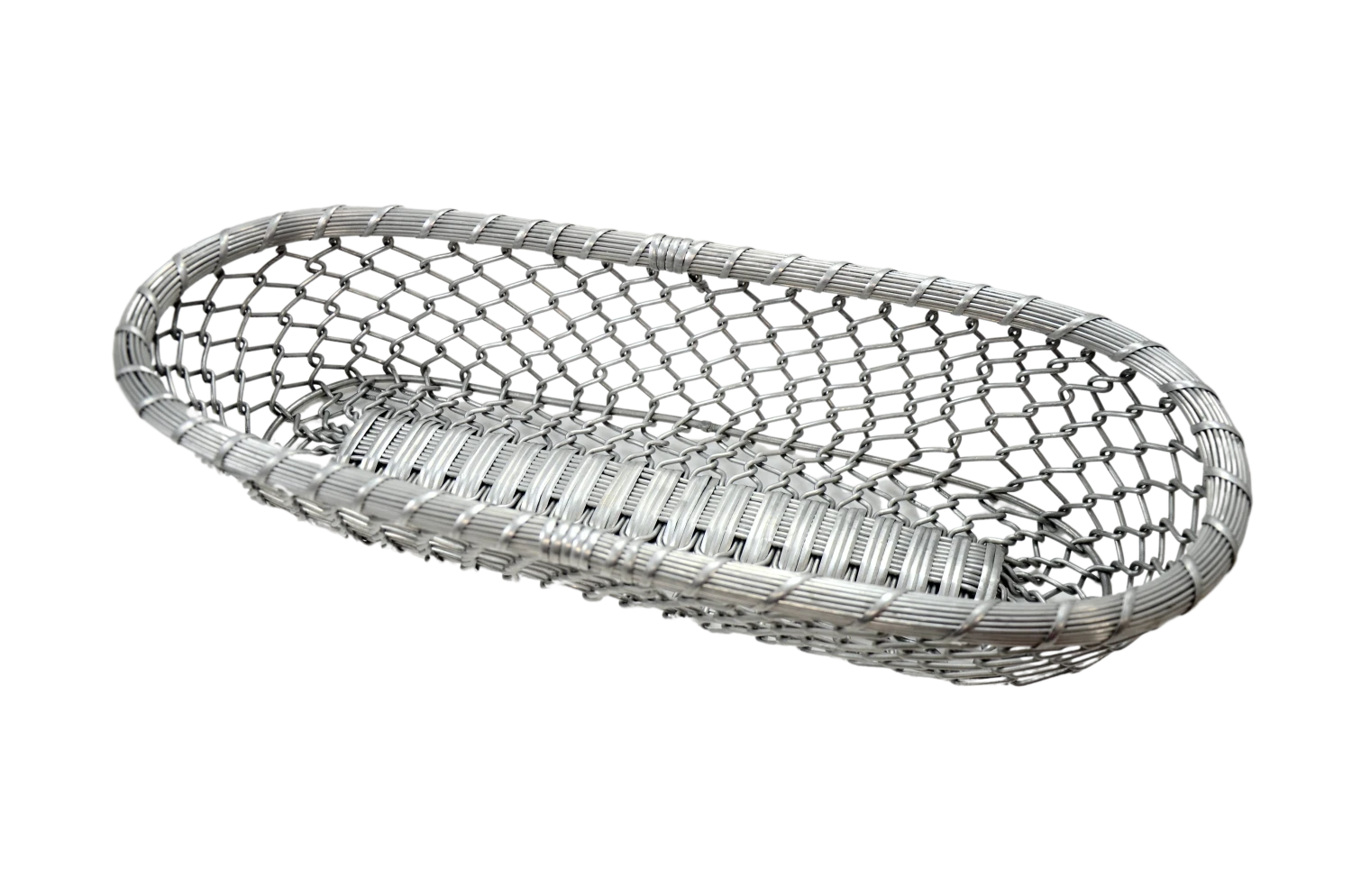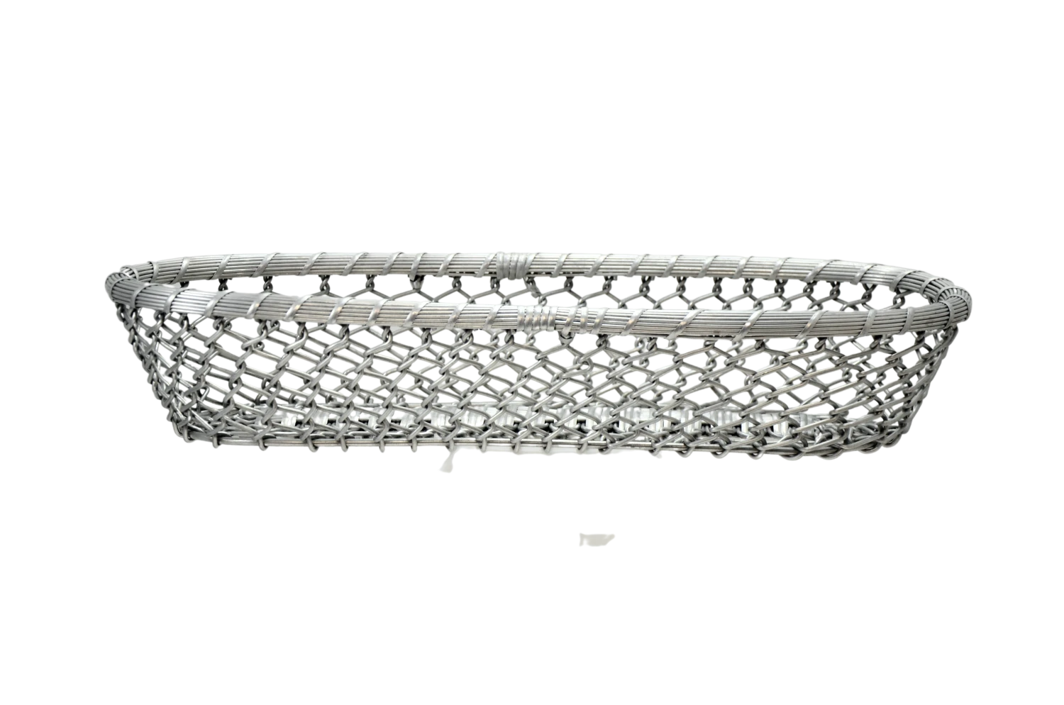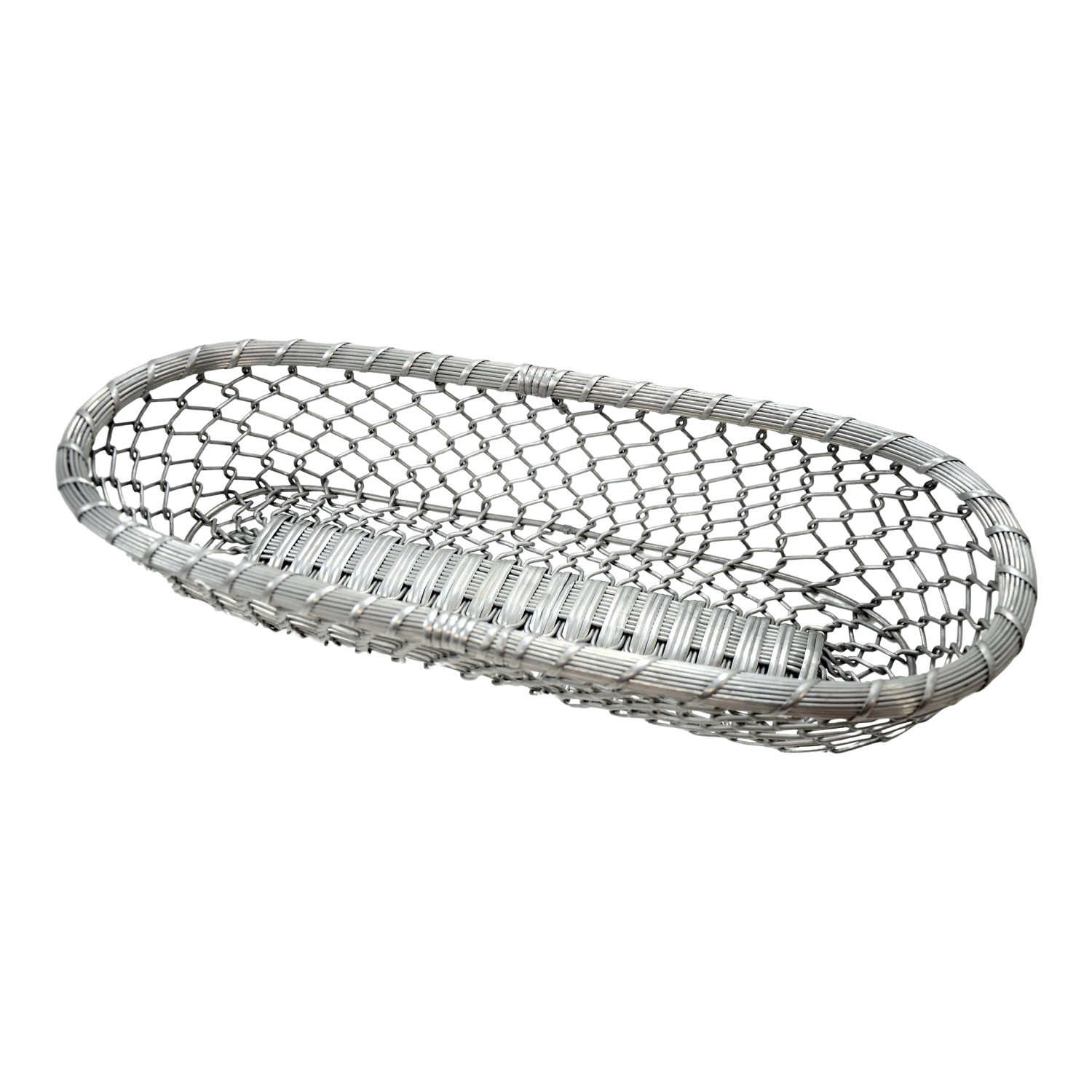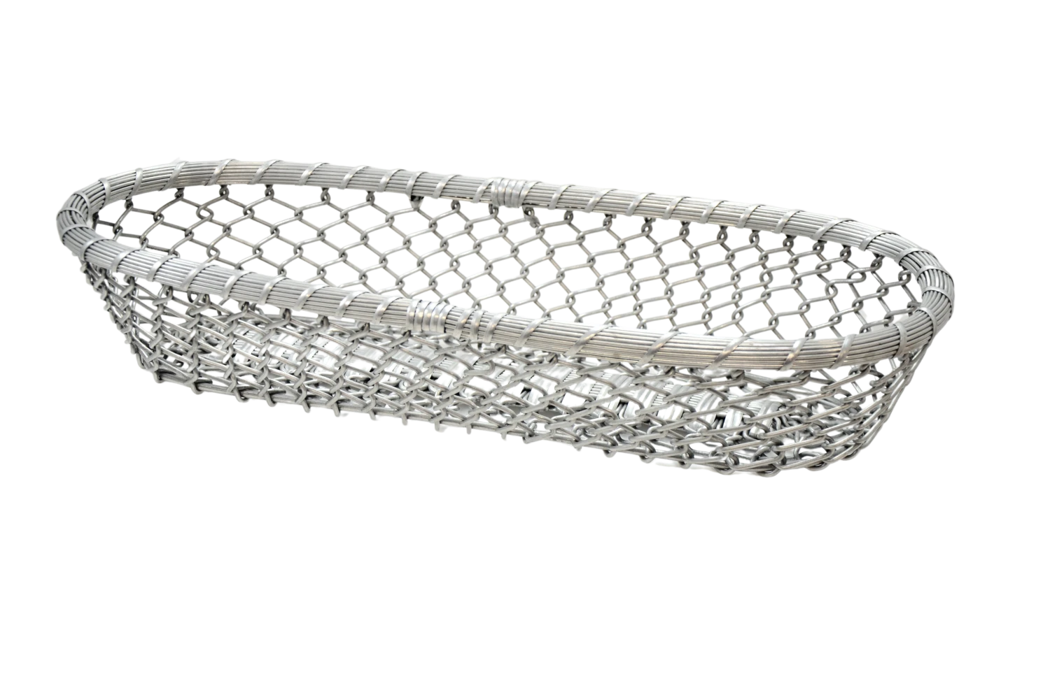 Long 17 inch woven silver metal basket with sturdy rim and base. Lined with a cloth to serve bread. Fill with multiple potted plants. Endless uses! No maker’s mark. Light wear.