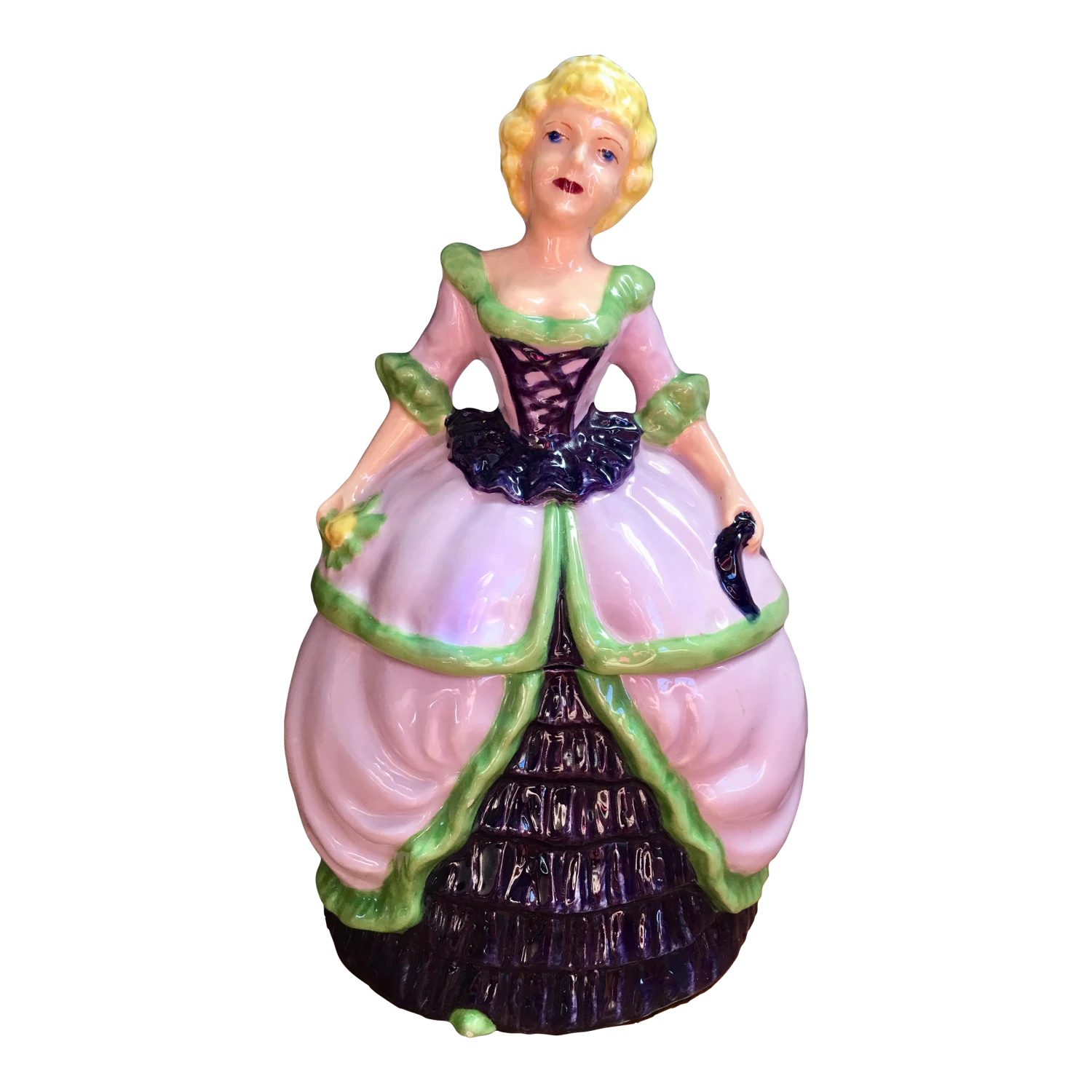 Vintage lovely ceramic storage box in the shape of a Victorian lady holding a flower and ribbon. The middle section …