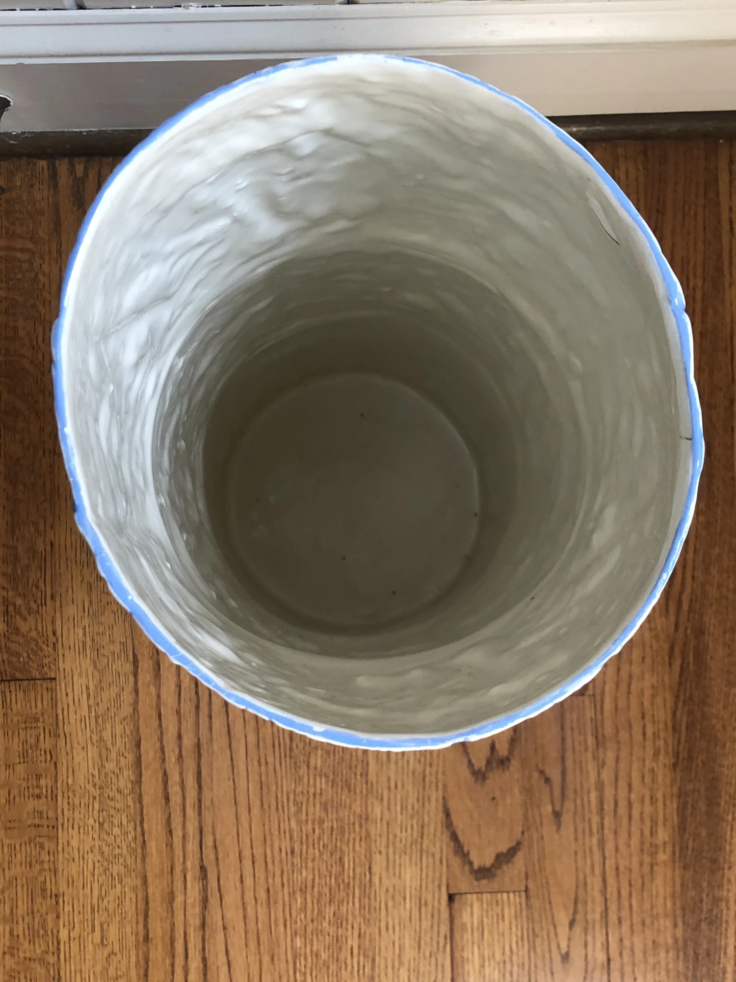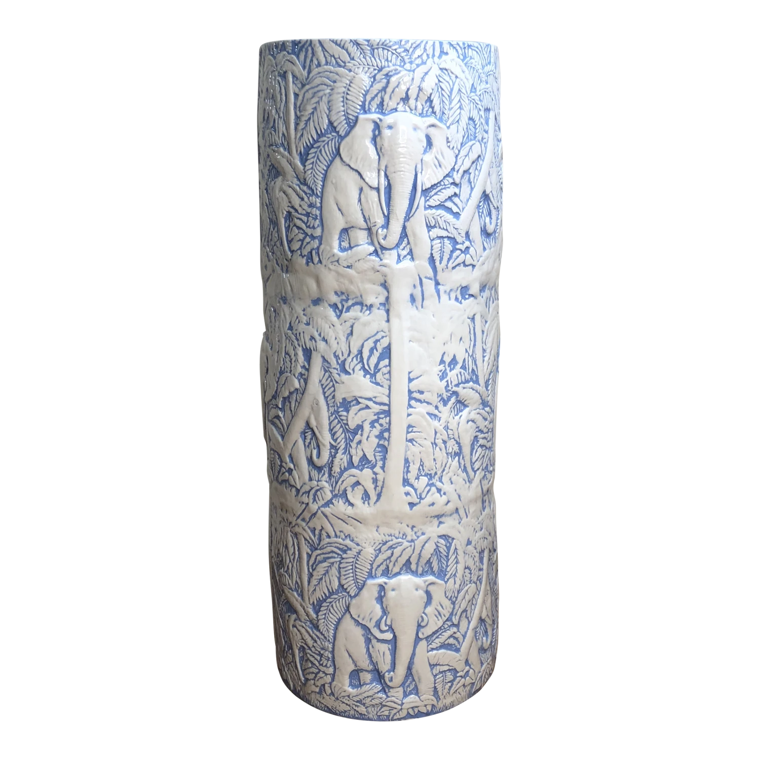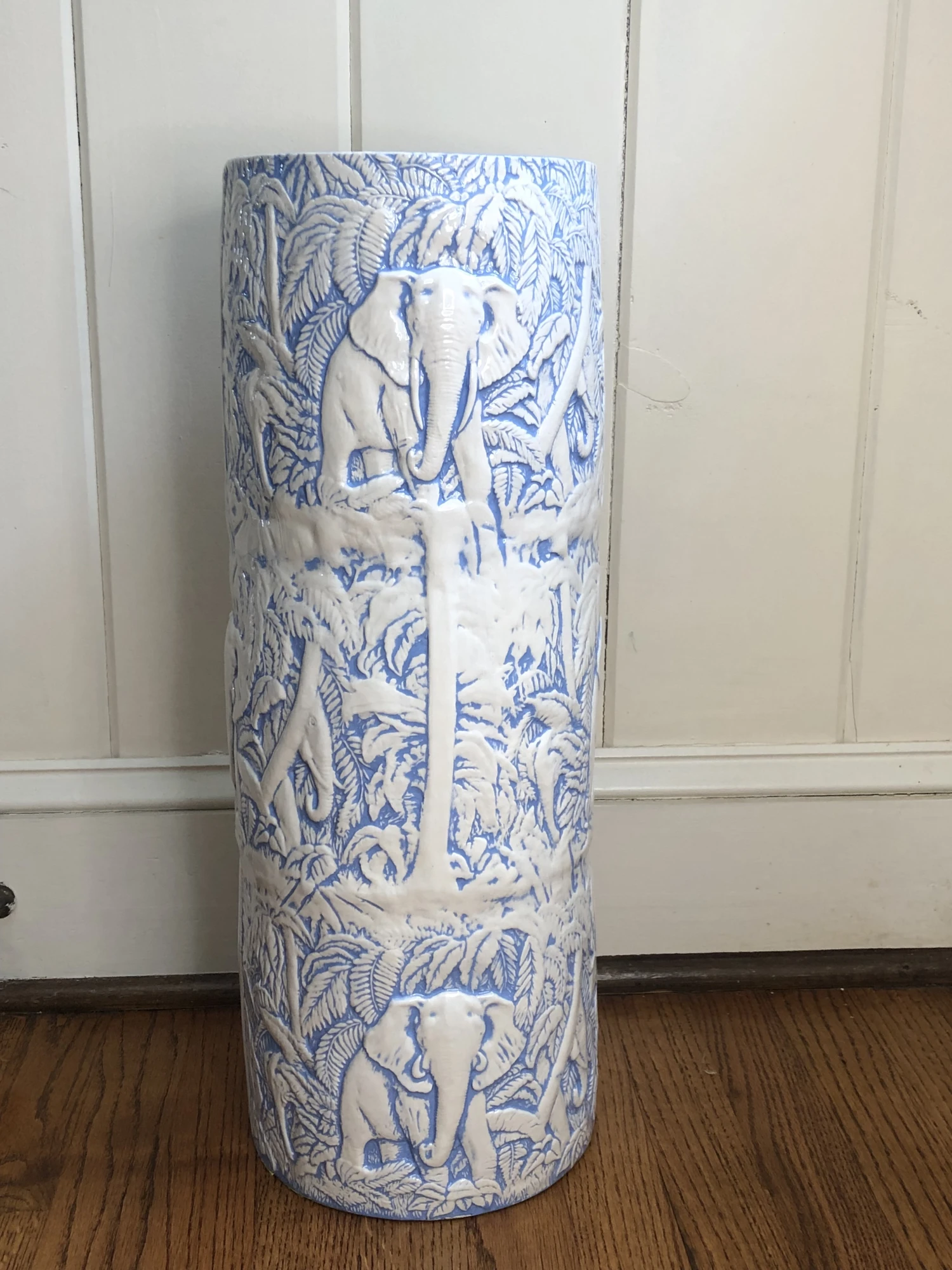 Blue and white vintage ceramic umbrella stand with elephant & jungle scene.