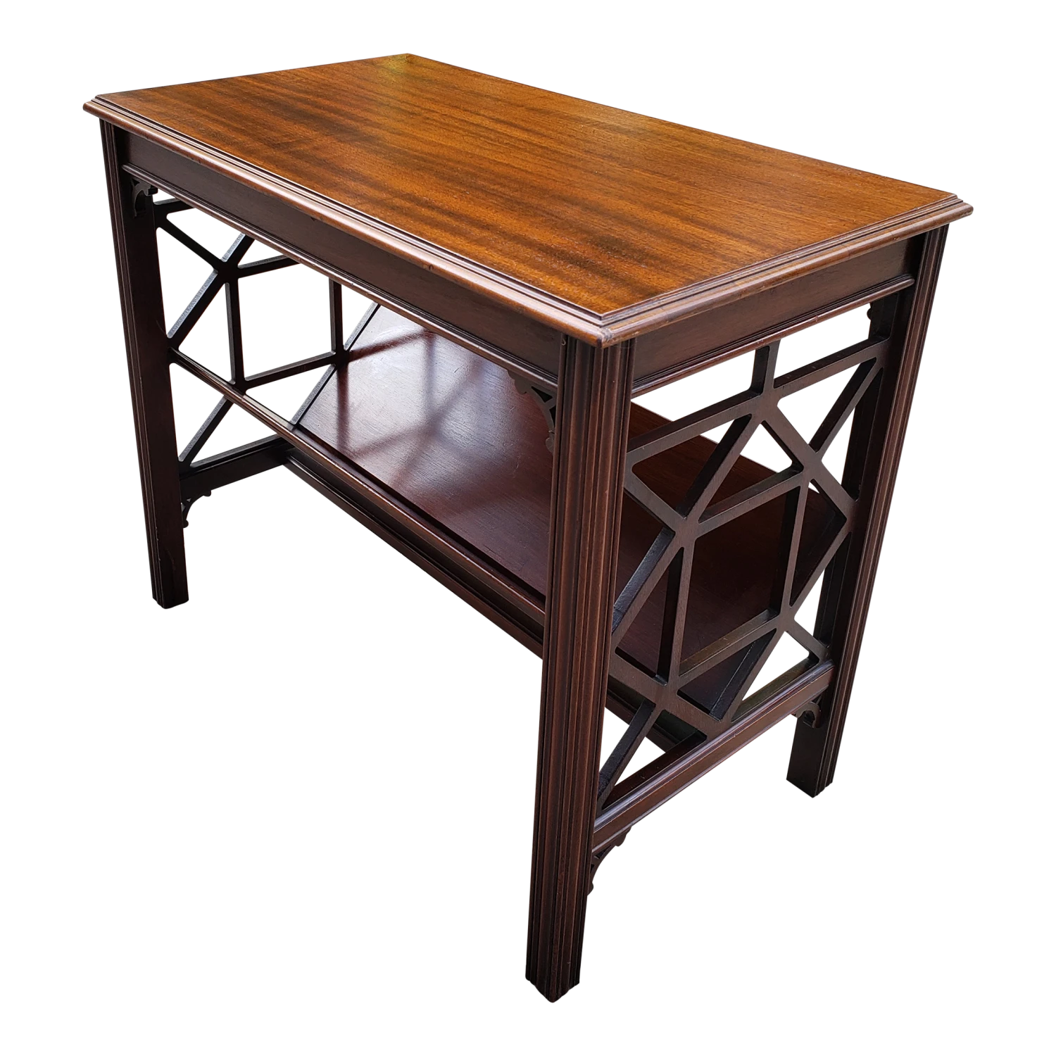 Offering a vintage mahagony Chippendale Style book mahagony rack with occasional table.
