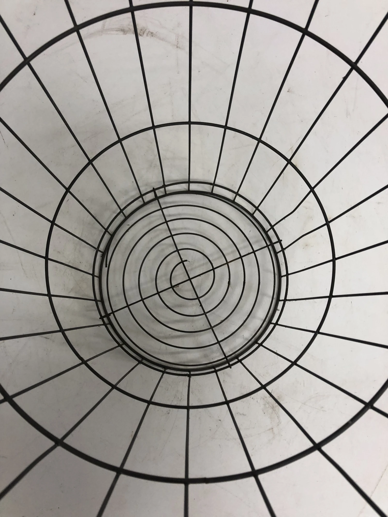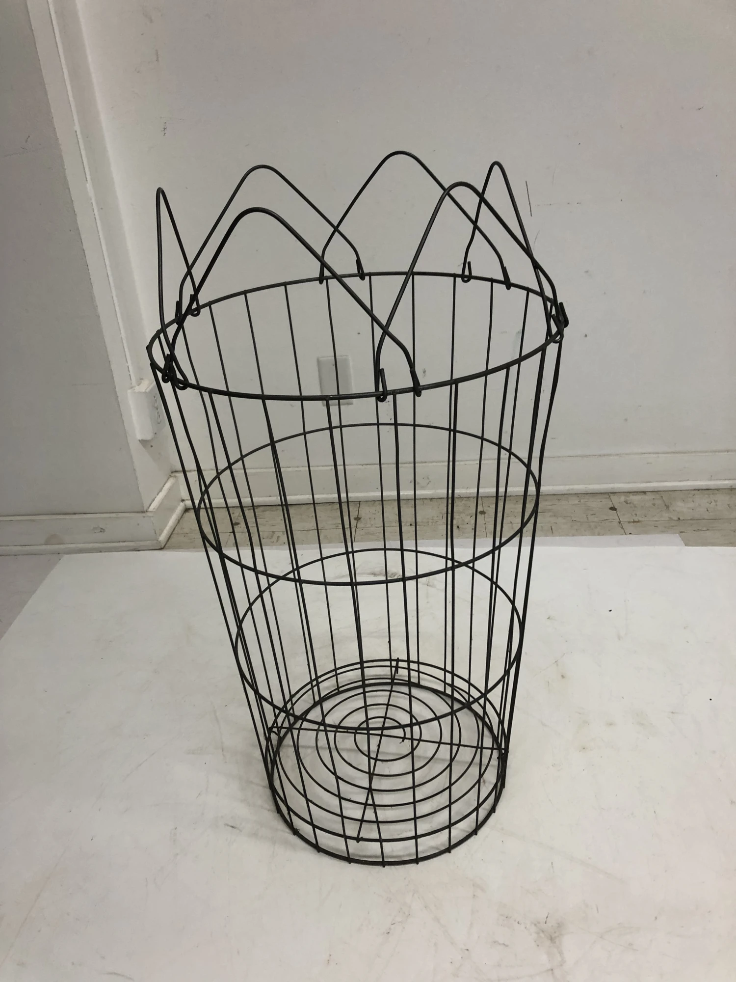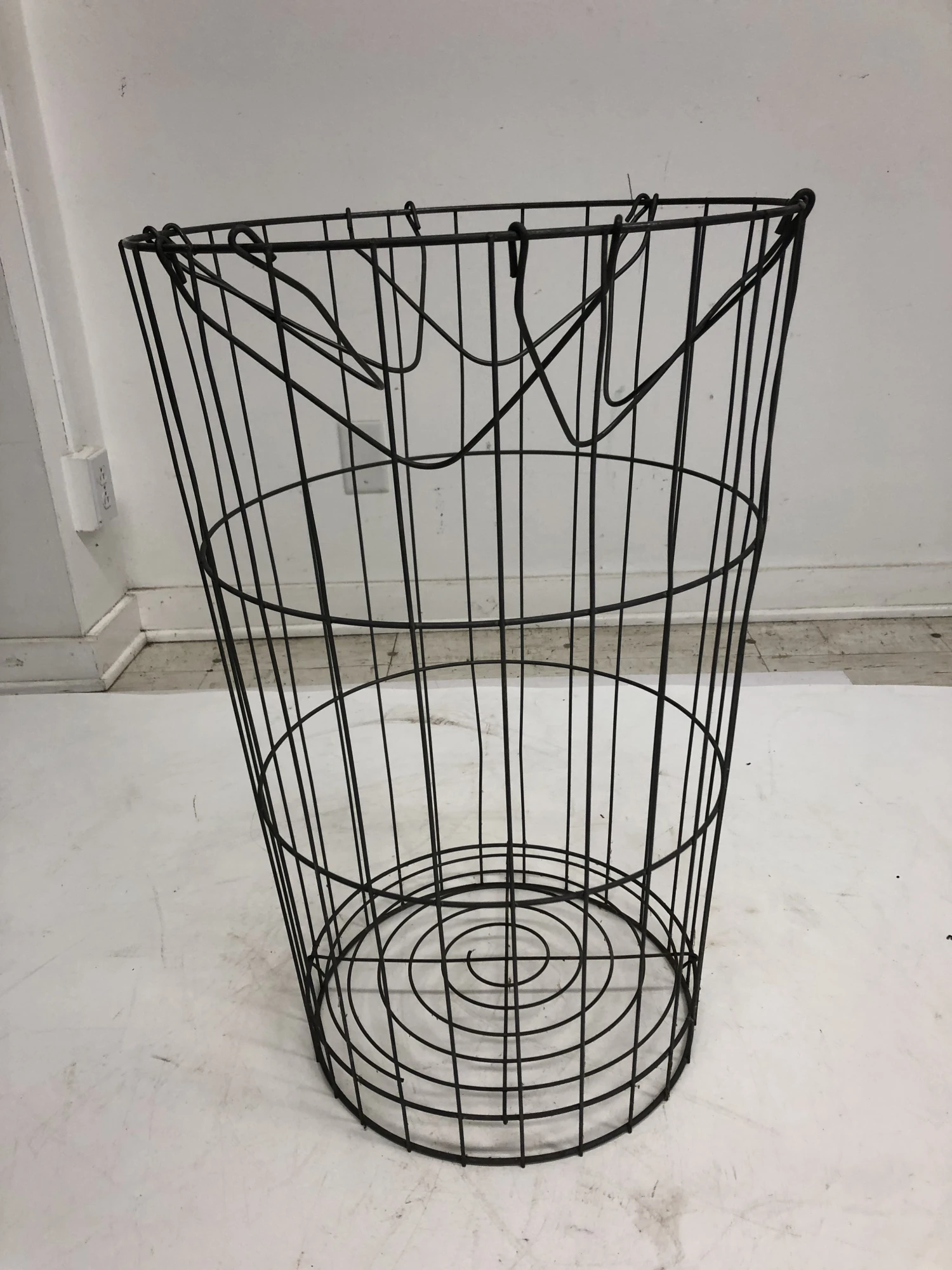 Collapsible lid. Beautiful gray wire steel construction. Piece dates to the 1940s/1950s and has a great vintage, rustic look. Measures approx 28″ tall x 18″ diameter.