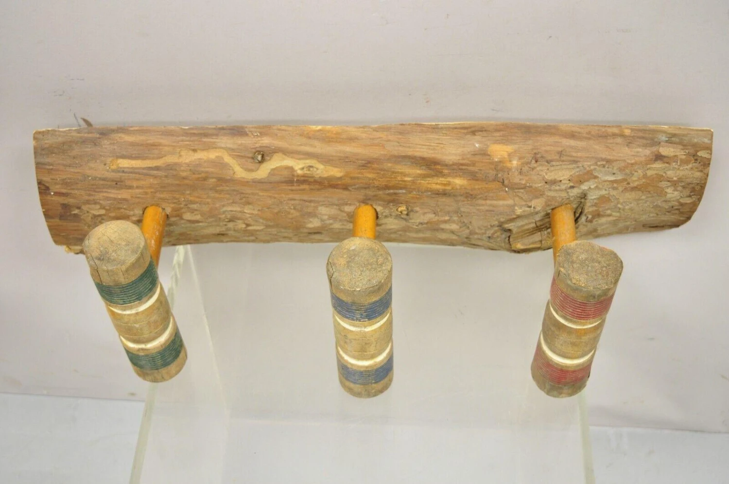 Vintage Croquet Mallet Repurposed Wall Hook Hat Rack Shelf Holder. Great for use as a rack of hat / coat hook, made from vintage croquet mallets. Circa Early to Mid 20th Century. Measurements: 7″ H x 24.25″ W x 7″ D.