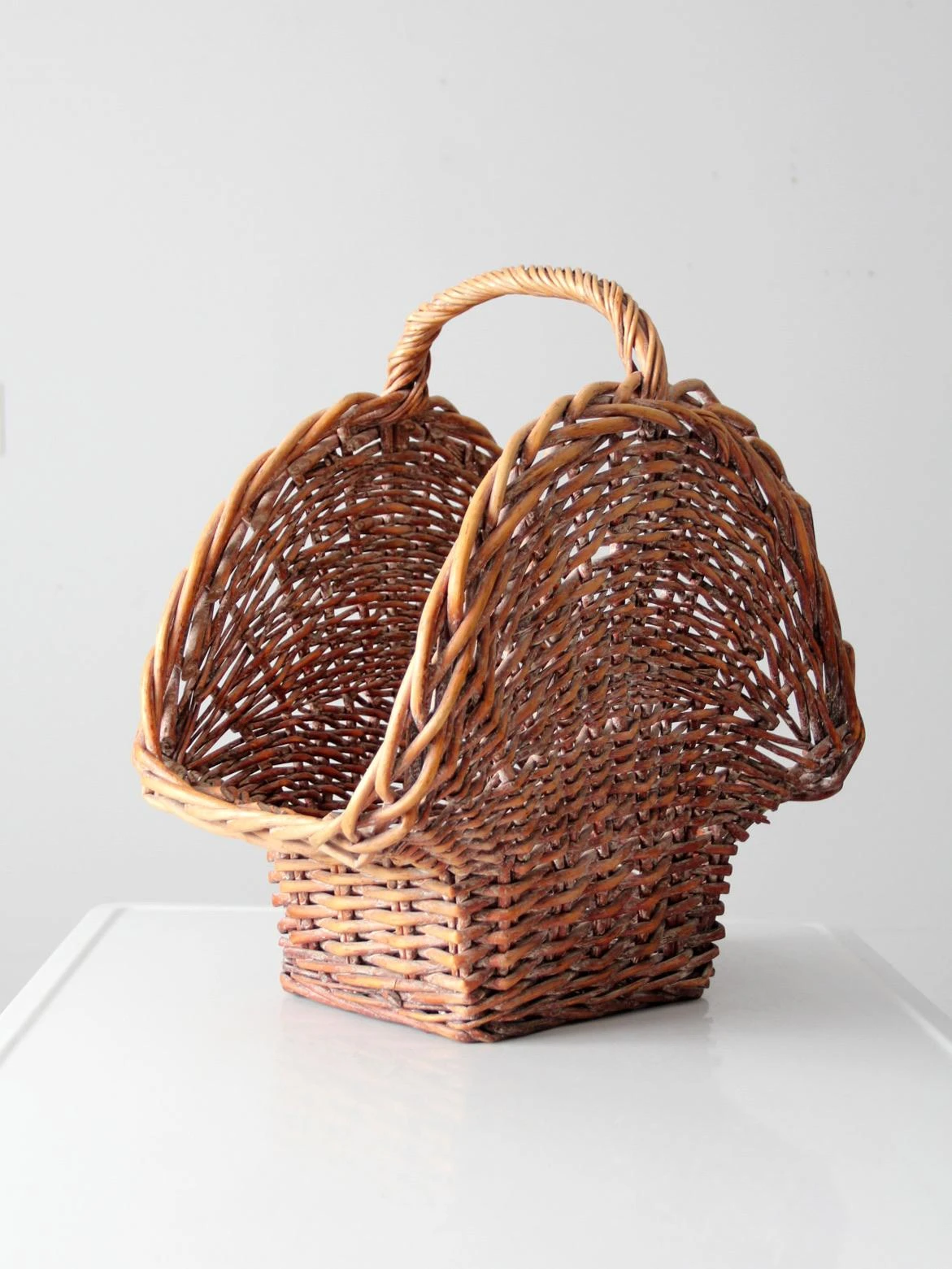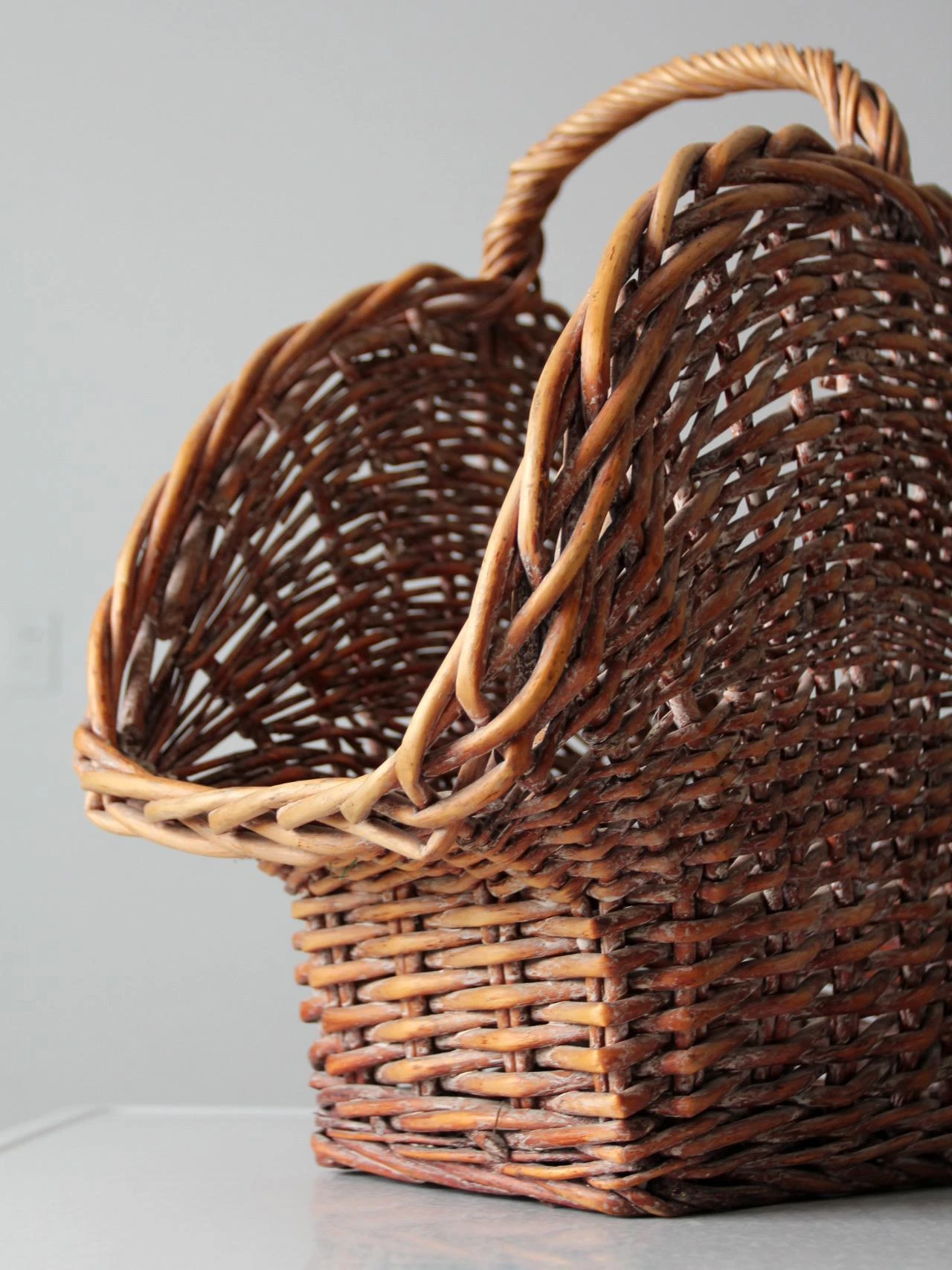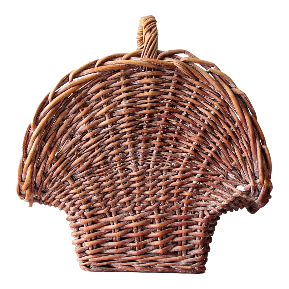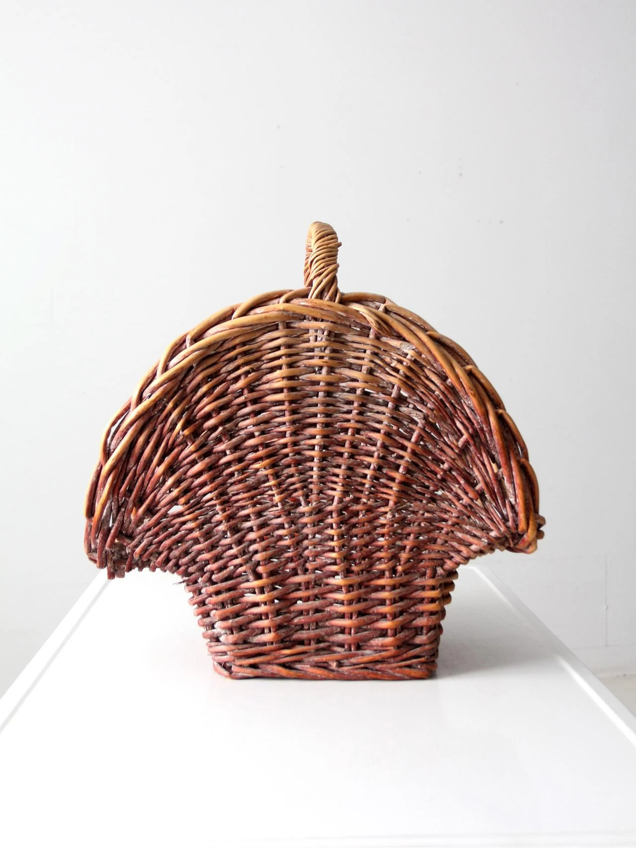 Here is a vintage woven basket. The fan shaped flower basket features a top handle with scallop shaped body and square base. Beautiful russet tone to the splint weave. An ideal gathering basket for both outdoor and in. Works marvelously as a flower display, or for storing linens, magazines, etc.