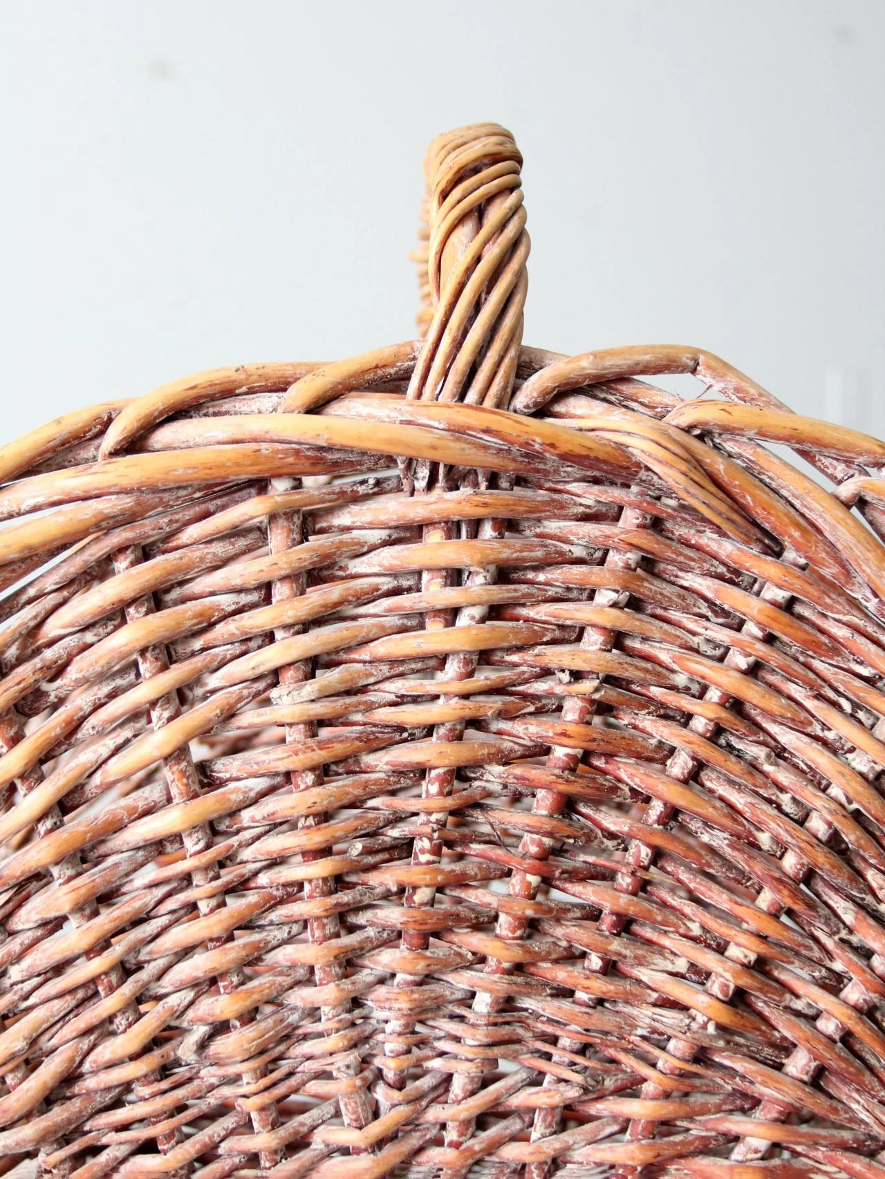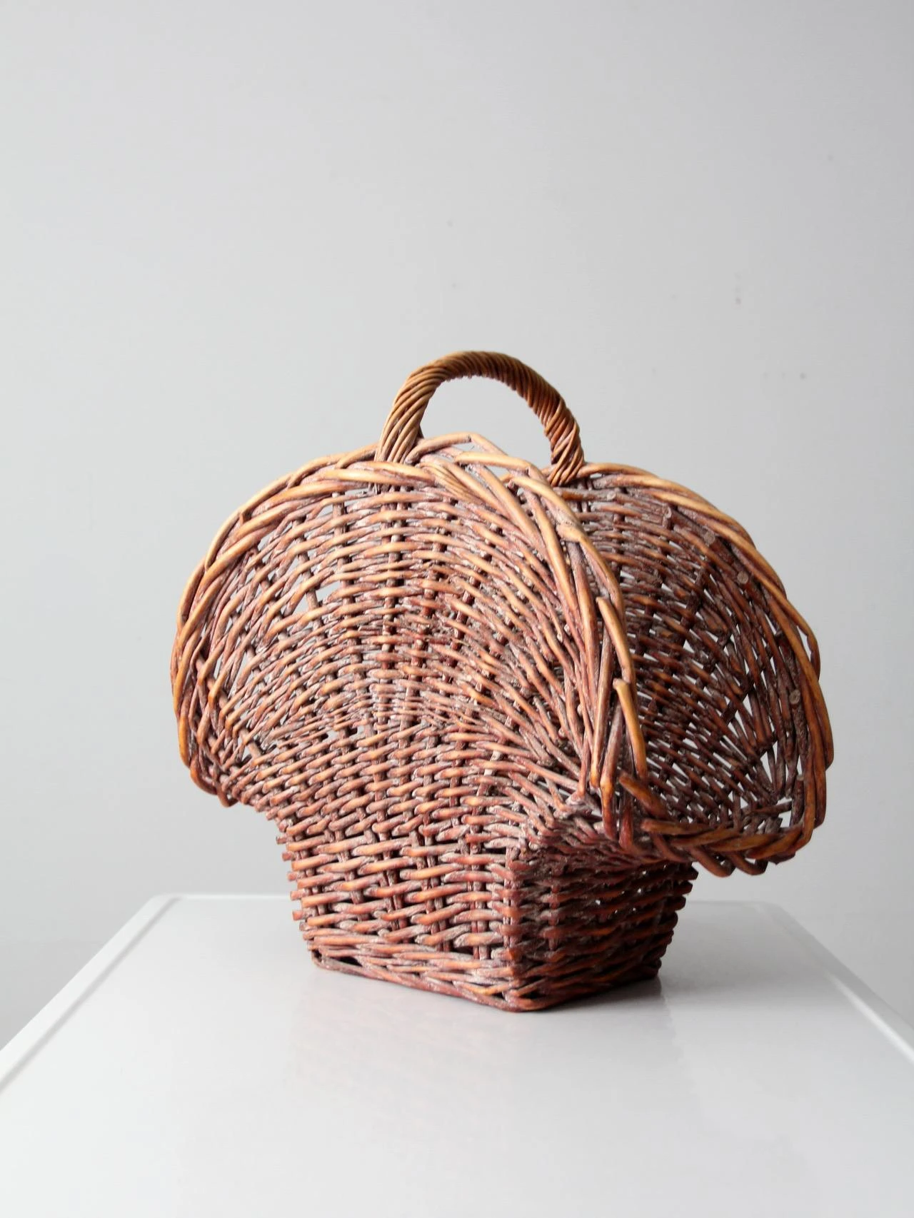 Here is a vintage woven basket. The fan shaped flower basket features a top handle with scallop shaped body and …
