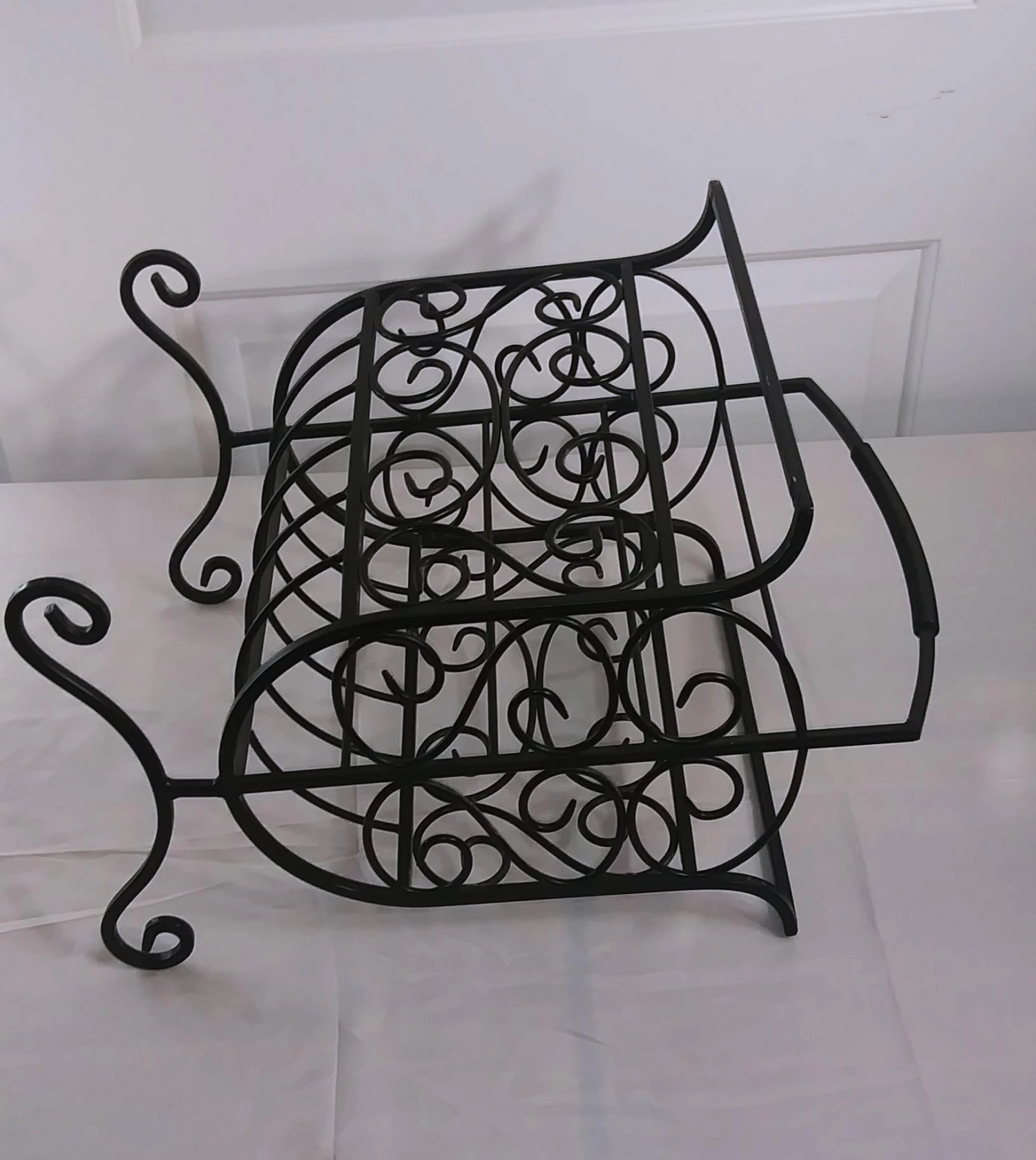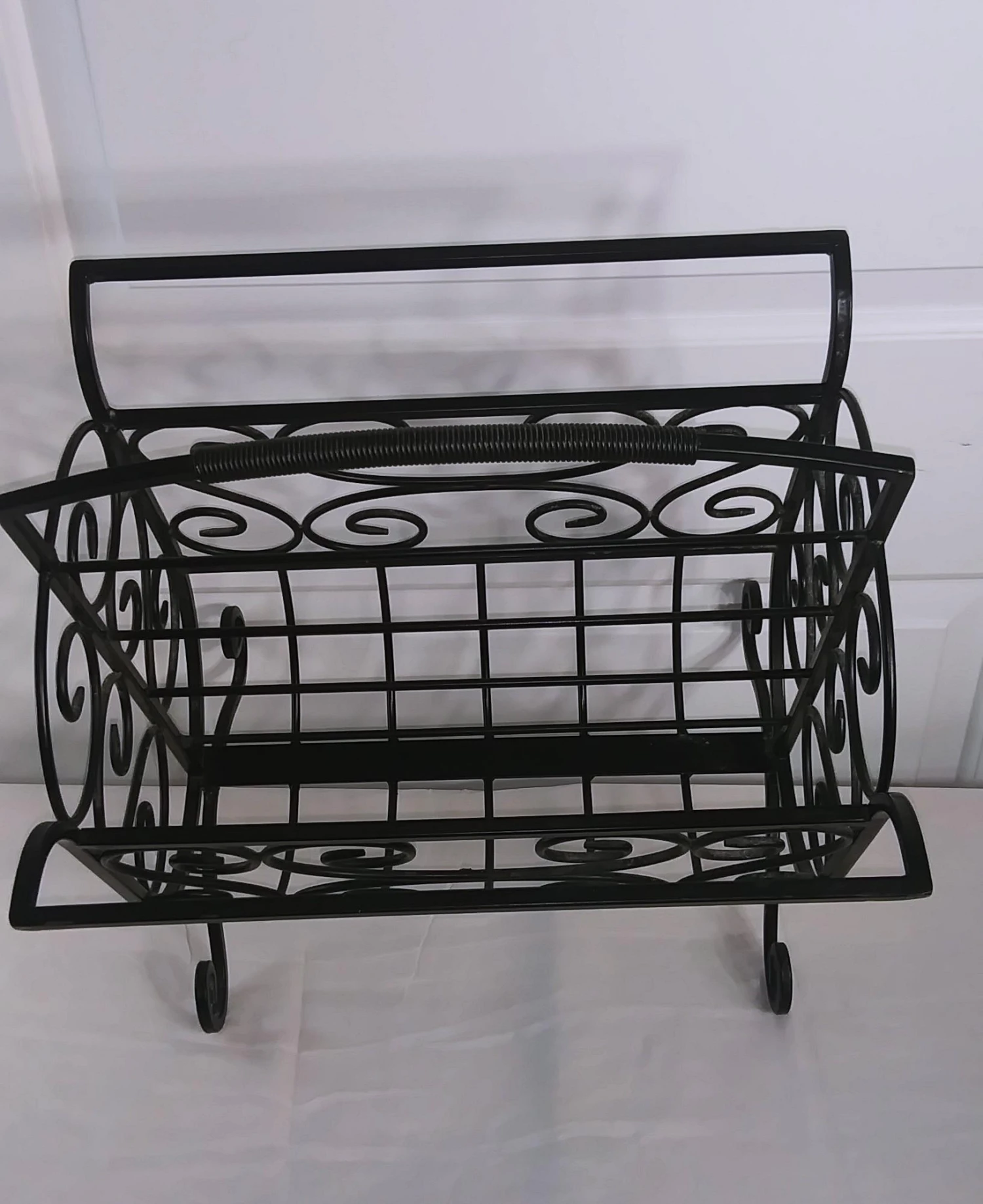What a splendid wrought iron work of art, also known as a magazine rack. This sturdy piece weighs about 10 lbs., it is doubled sided and can be used in multiple ways: as a wood holder by your fireplace, a can organizer in your pantry, a clean towel holder for your bath, a binder storage in your office – your creativity can run wild.