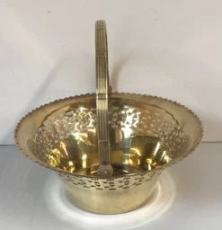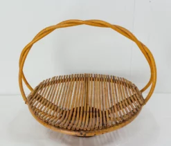 Set of two green harvest-style splint baskets, with handles on each end. Great for so many uses inside and out–gathering mail, collecting garden flowers, or serving up rolls on a buffet. Reinforced with wood inside and on the bottom to hold heavier items and keep baskets in shape. Made in the early 2000s. In excellent condition–some fading of the green in places and one split bottom stabilizer (does not affect stability or use). Please see pictures for detail and condition.