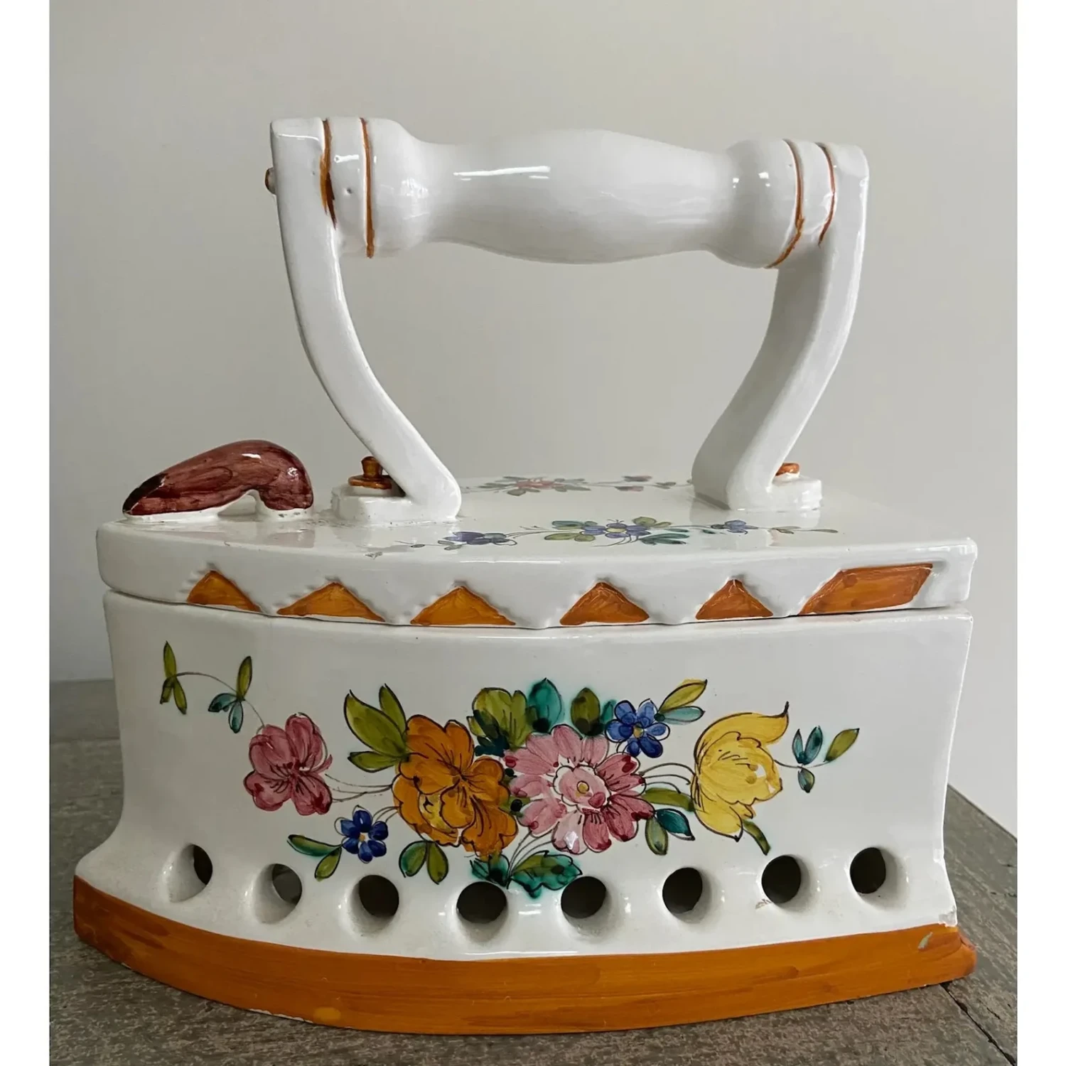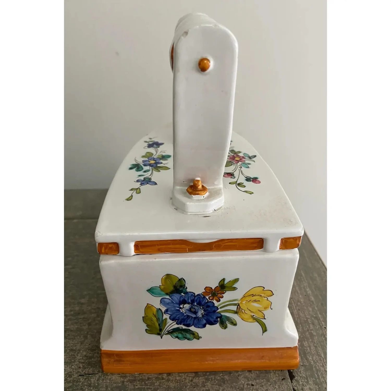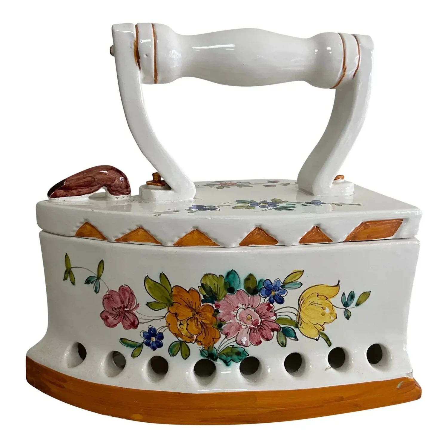 Charming vintage ceramic pomander or potpourri box in the form of a flat or sad iron. The lidded box is beautifully hand painted with flowers and foliage. It is unmarked, but was most likely made in Italy.