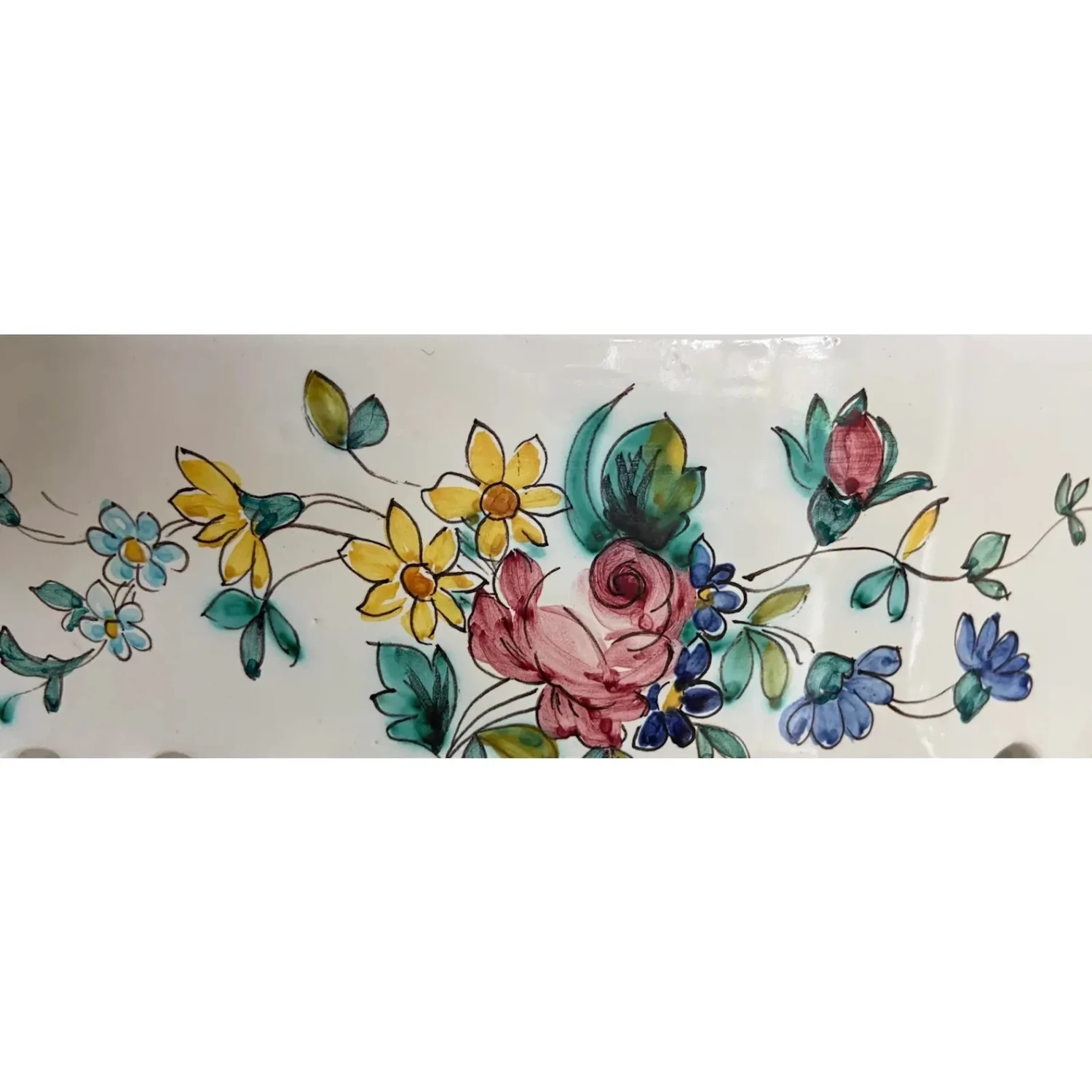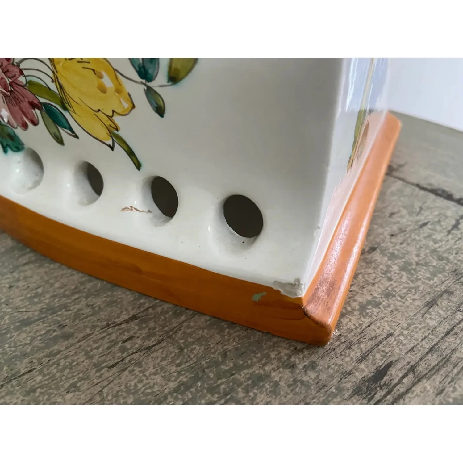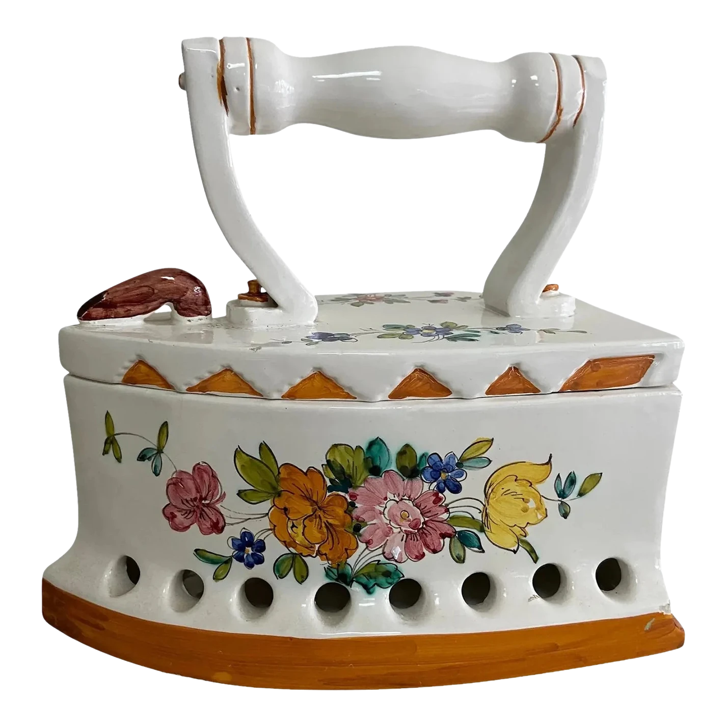 Charming vintage ceramic pomander or potpourri box in the form of a flat or sad iron. The lidded box is beautifully hand painted with flowers and foliage. It is unmarked, but was most likely made in Italy.