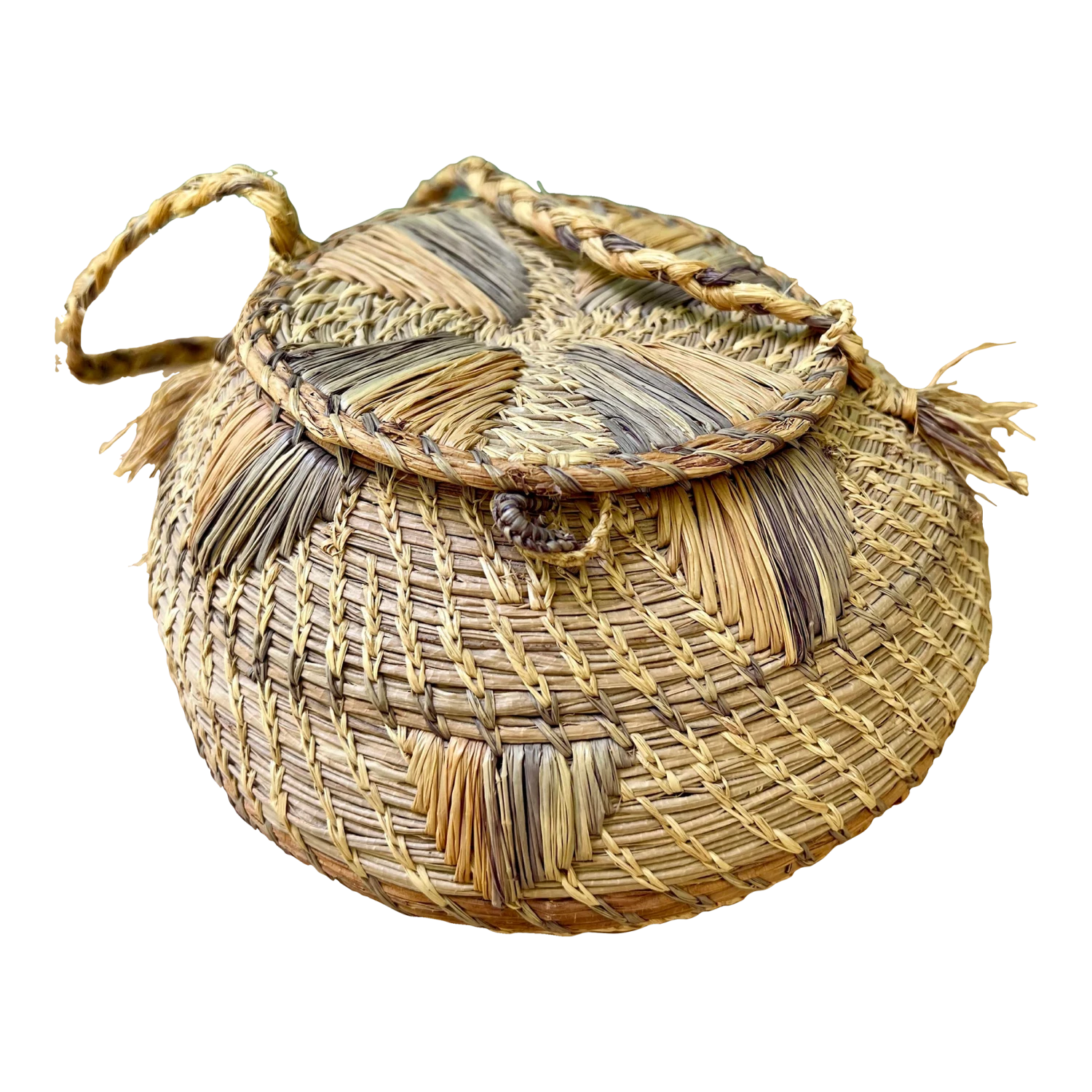Small, woven pine needle, lidded basket with braided carrying handle and braided latch for securing lid in place. Meticulous craftsmanship. …