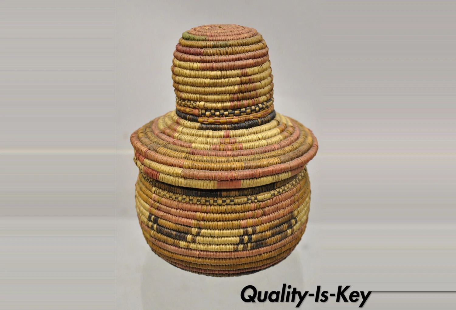 Vintage Nigerian African Tribal Hausa Woven Orange Basket with Dome Lid. Item features a hand woven basket with lid. Circa …