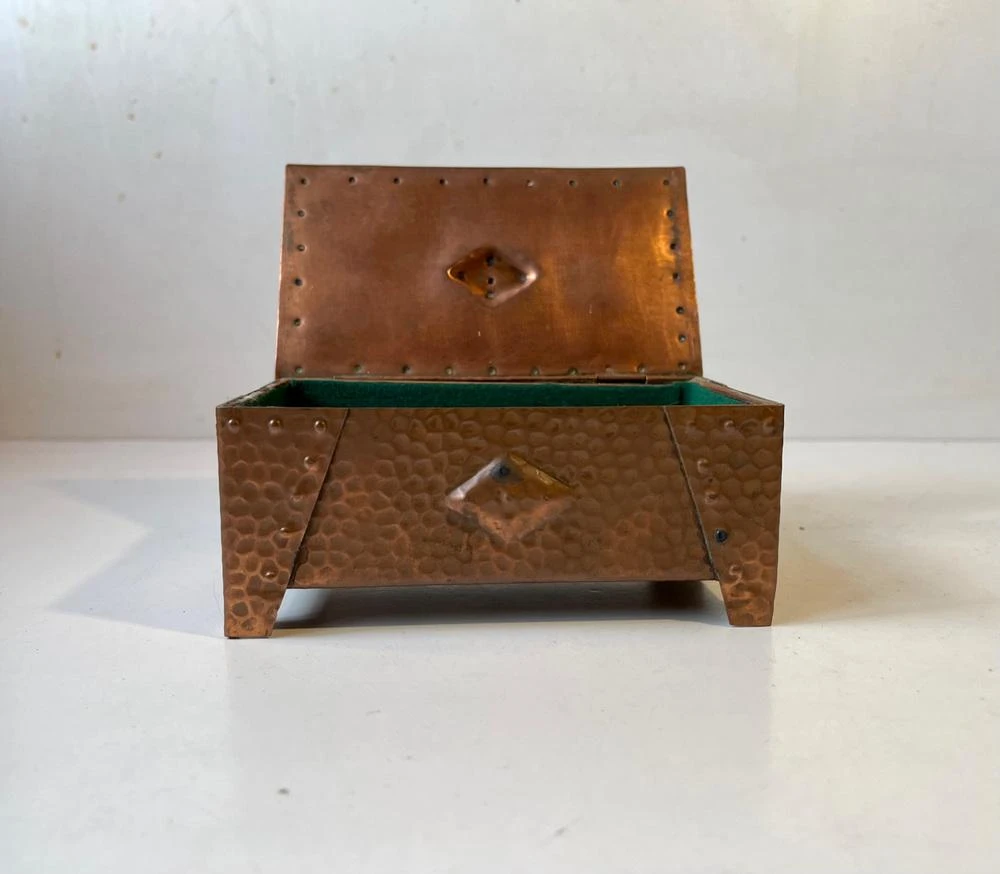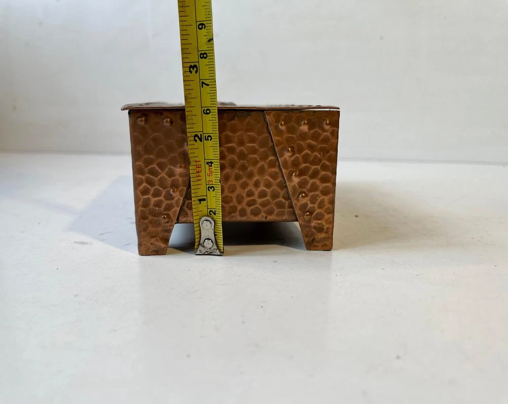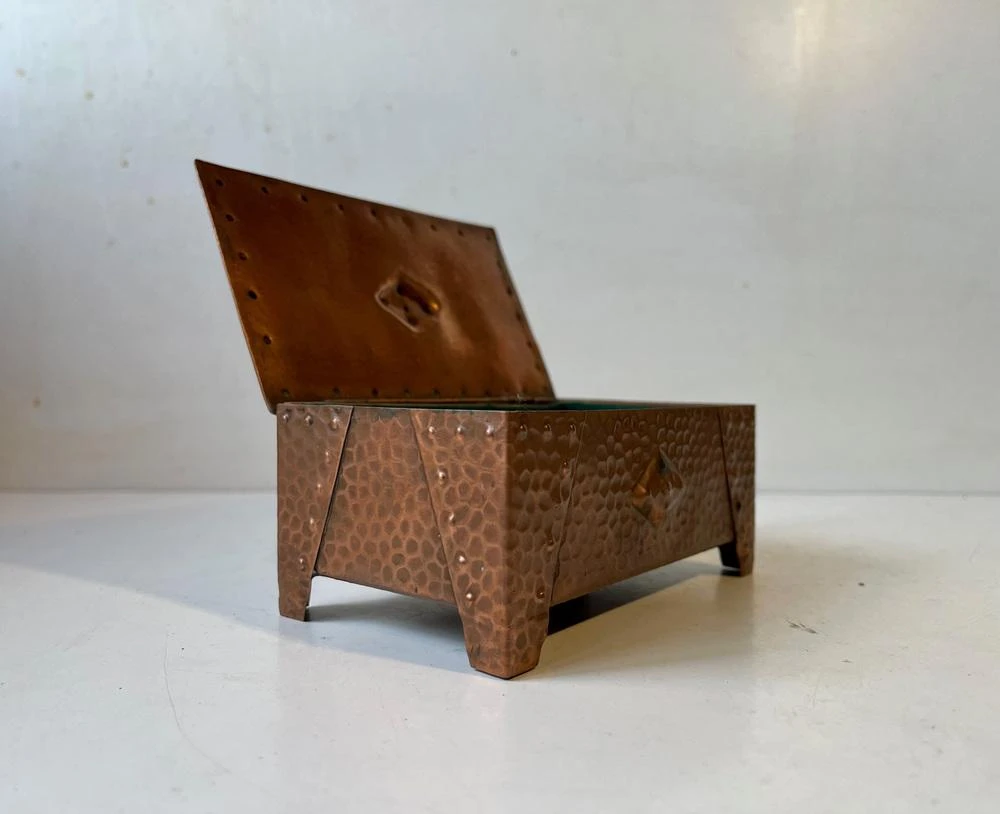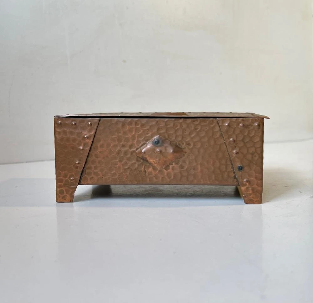A wellmade and beautifully patinated box in hammered copper. Suitable for Jewelry or small personal items. Distinct brutalist styling with of Art Deco architectural element. It was made in Scandinavia circa 1930-40. Measurements: W: 15 cm, Dept: 9 cm, H: 6 cm.